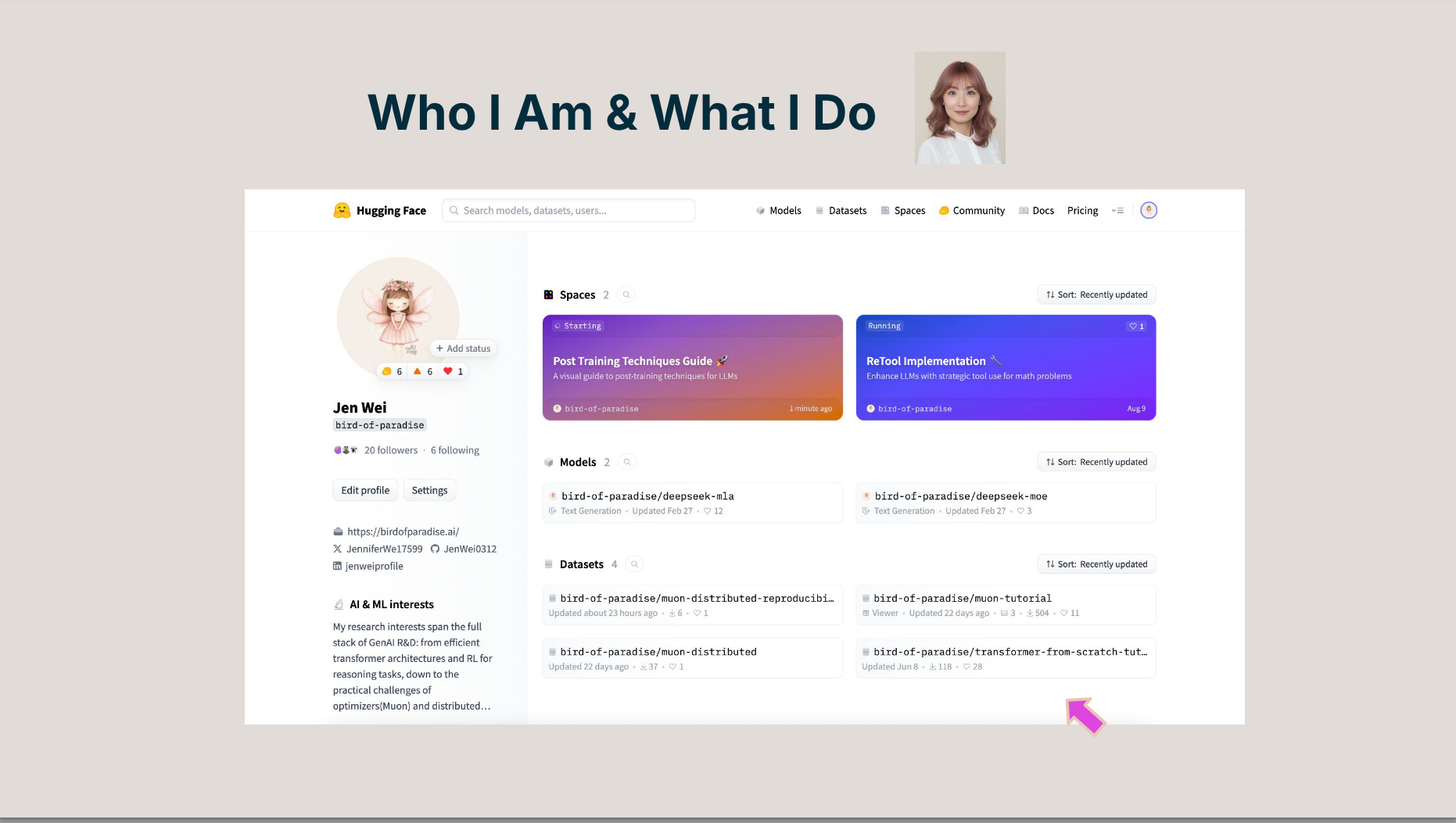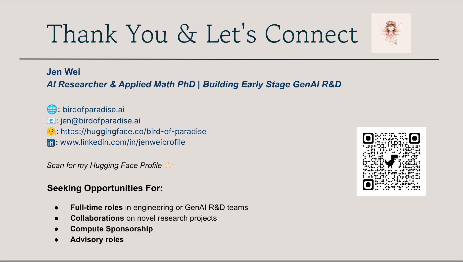 Jen Wei is an independent AI research engineer with a PhD in applied mathematics and a love for building things from scratch — especially when she probably shouldn’t. She’s reverse-engineered transformer architectures, implemented modern techniques like mixture-of-experts and Multi-head latent attention, and still enjoys writing clean PyTorch code at 2am for fun (and maybe for revenge). Jen currently works in the GenAI space and shares her work openly on Hugging Face. Her favorite research topics include efficient LLM architecture, post-training techniques, and the existential crises of overparameterized models.