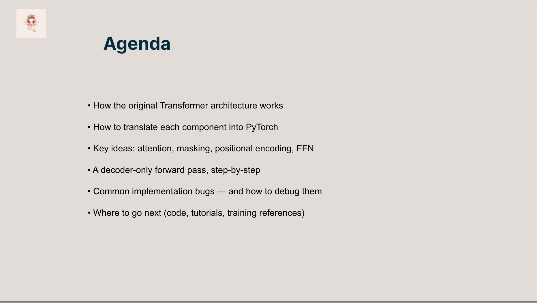 This talk is designed for attendees with a basic understanding of deep learning and PyTorch who want to go beyond surface-level blog posts and get a hands-on, conceptual grasp of what happens under the hood. You’ll see how each part of the transformer connects back to the equations in the original paper, how to debug common implementation pitfalls, and how to avoid getting lost in tensor dimension hell.