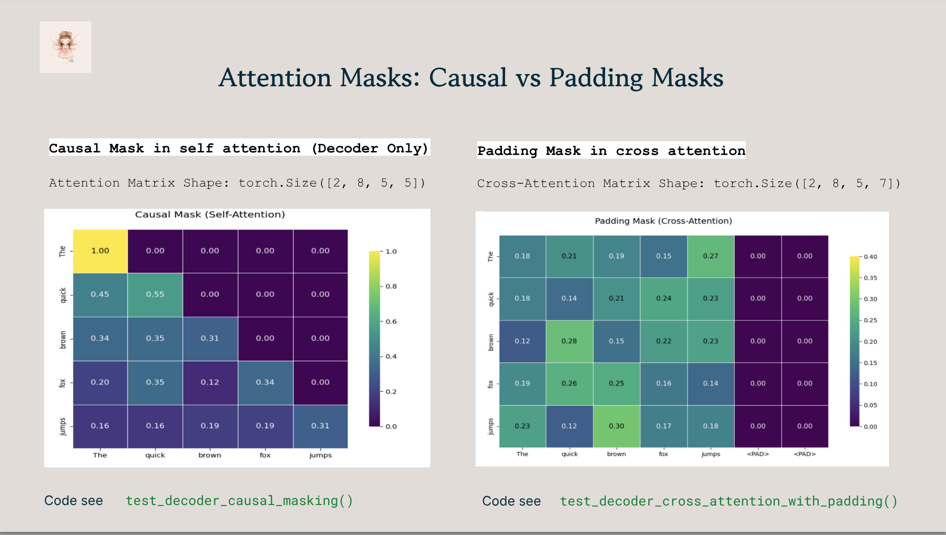 - 🧠 Visual explanations of attention masks, shapes, and residuals
