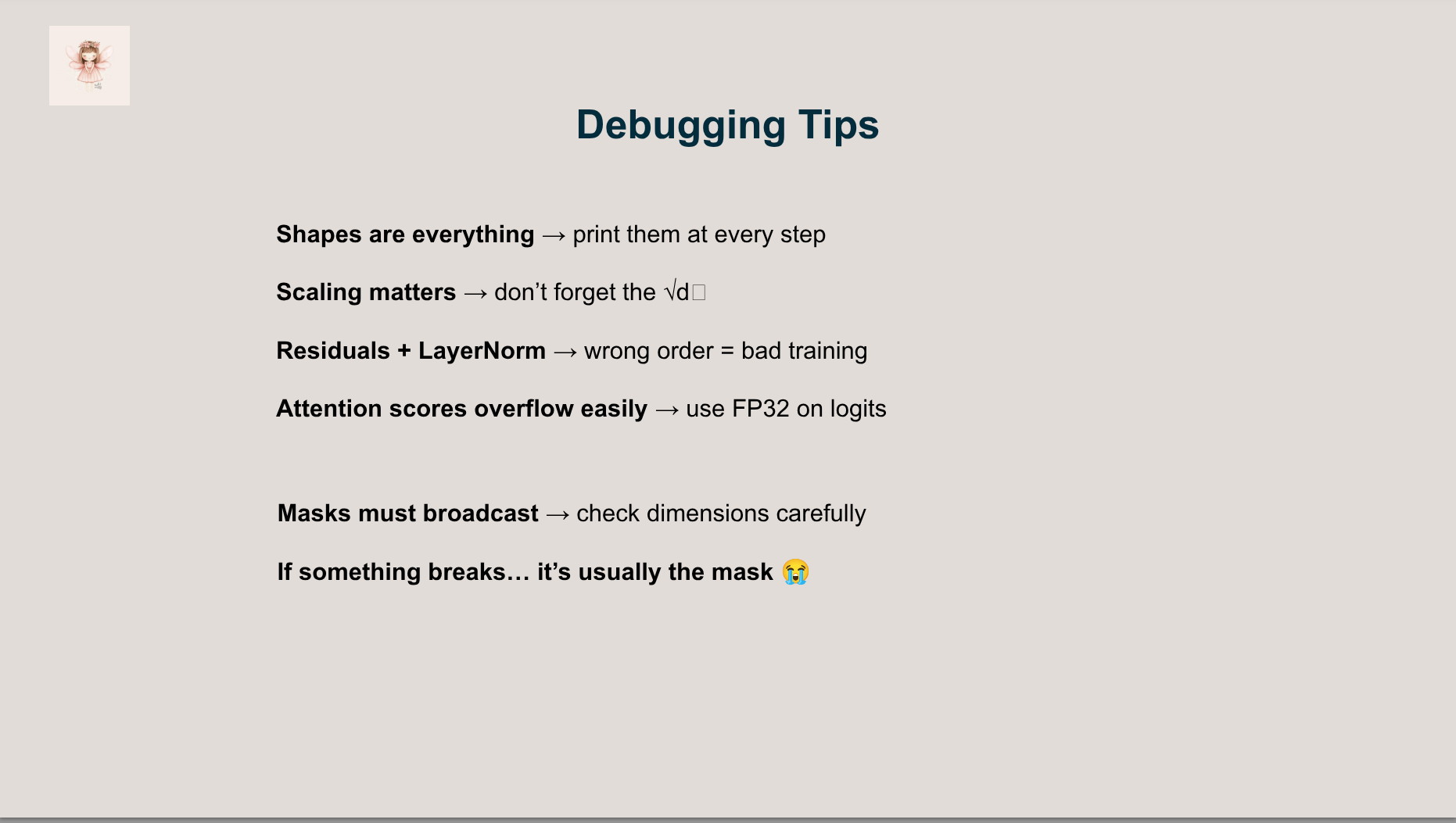 - ⚠️ Common bugs and debugging strategies (like handling shape mismatches and masking errors)
