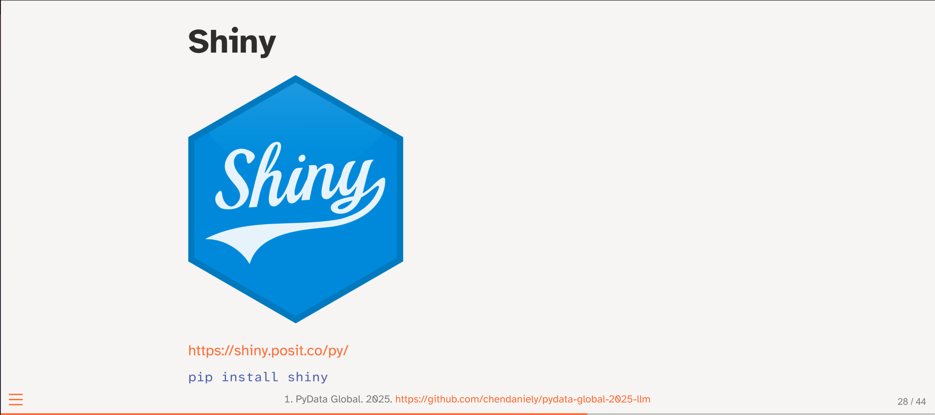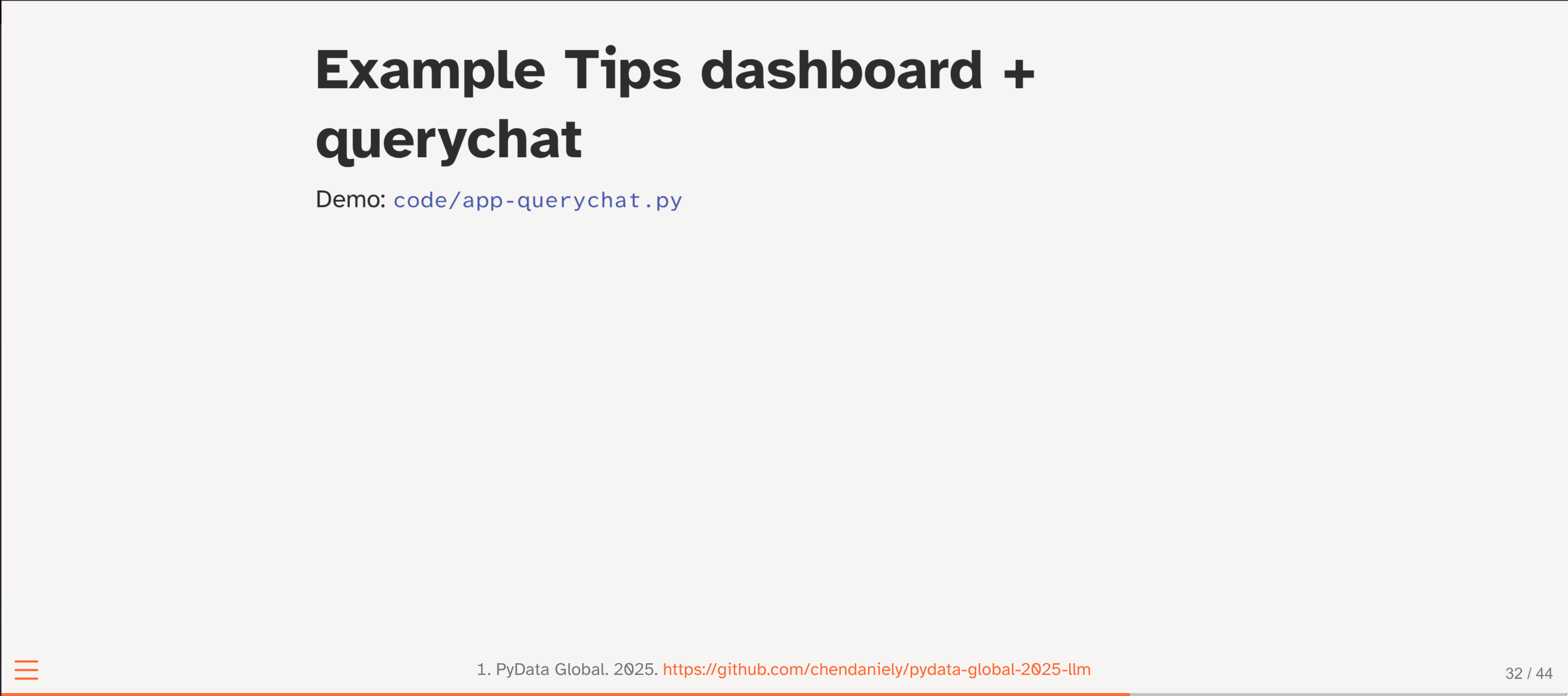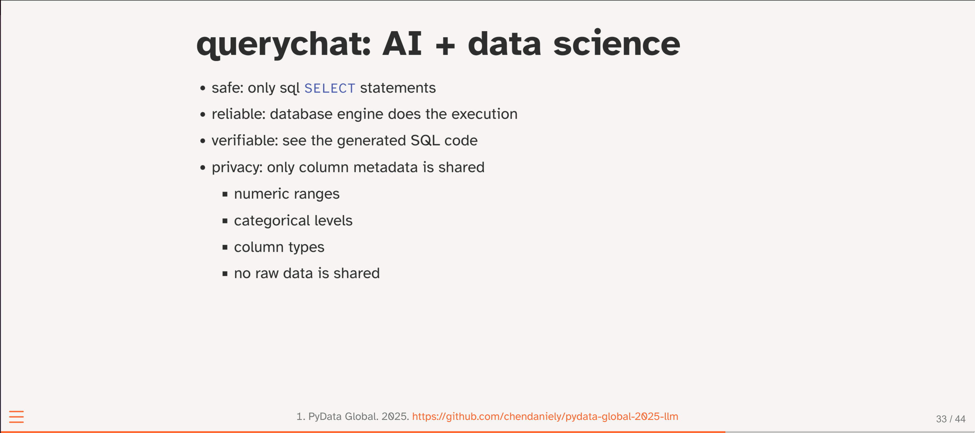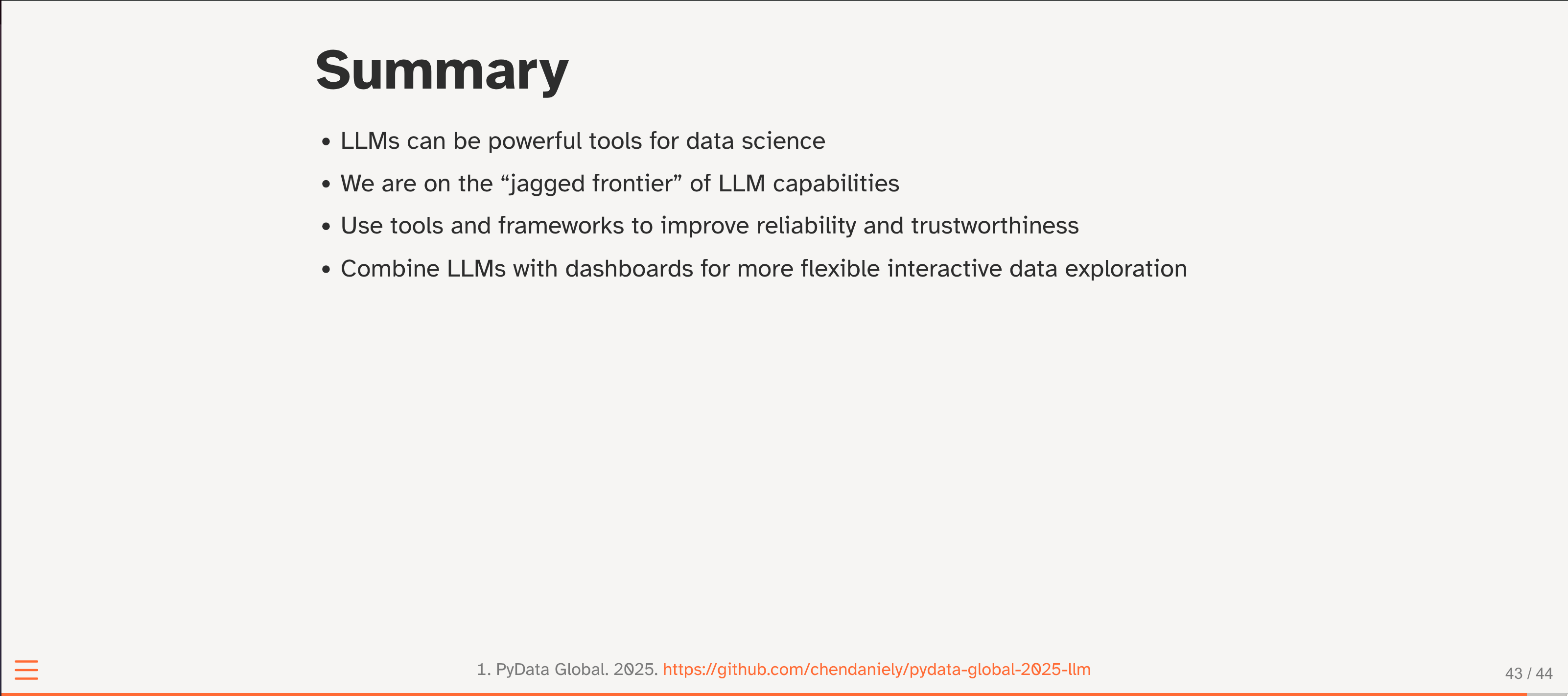 As a shiny user I have been planning to learn and use this chatlas package for a while, and this talk provided a great introduction to it. I liked the way Daniel Chen explained both the strengths and weaknesses of LLMs in data science contexts, and how to leverage their strengths while mitigating their weaknesses. The live demo of integrating Chatlas into a Shiny dashboard was particularly helpful, as it showed practical steps to create an AI-powered data product. Overall, this talk clarified how to responsibly use LLMs in my data science work.