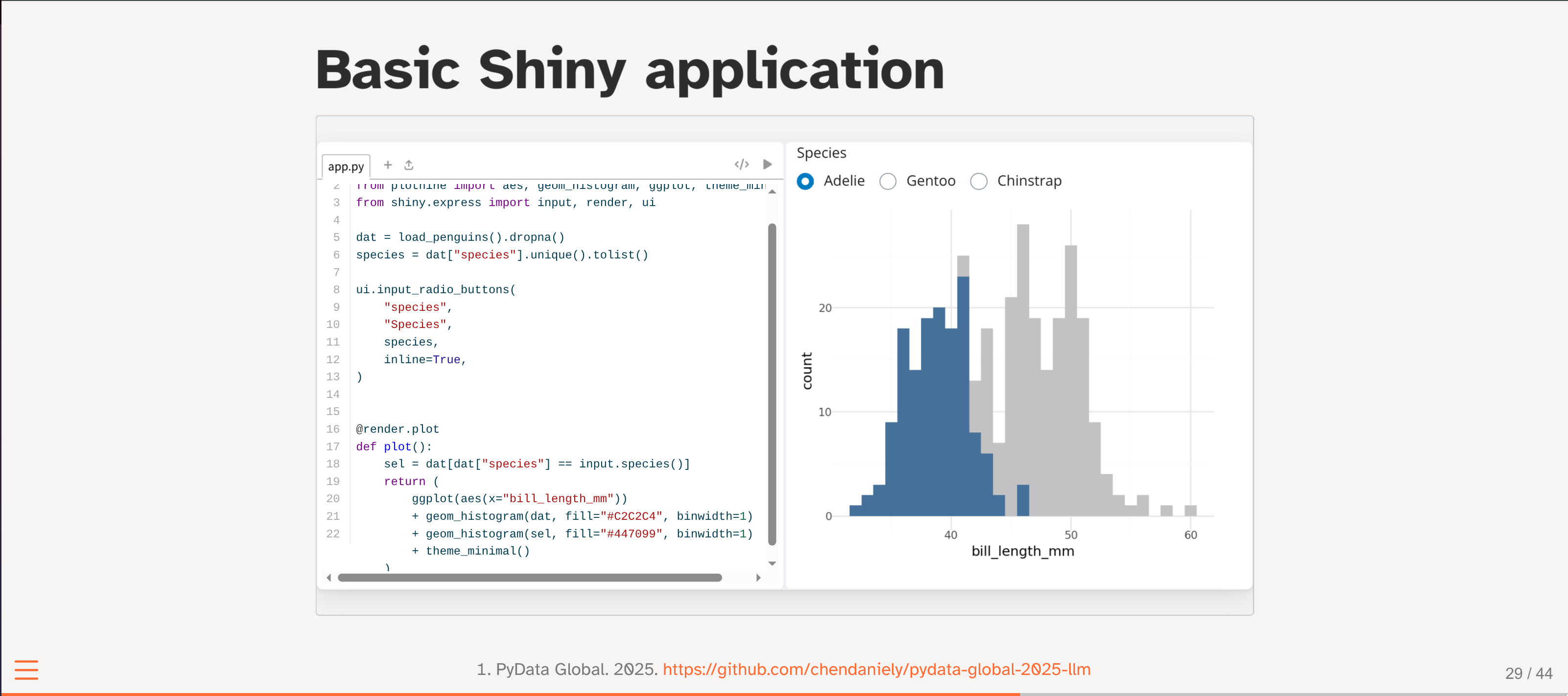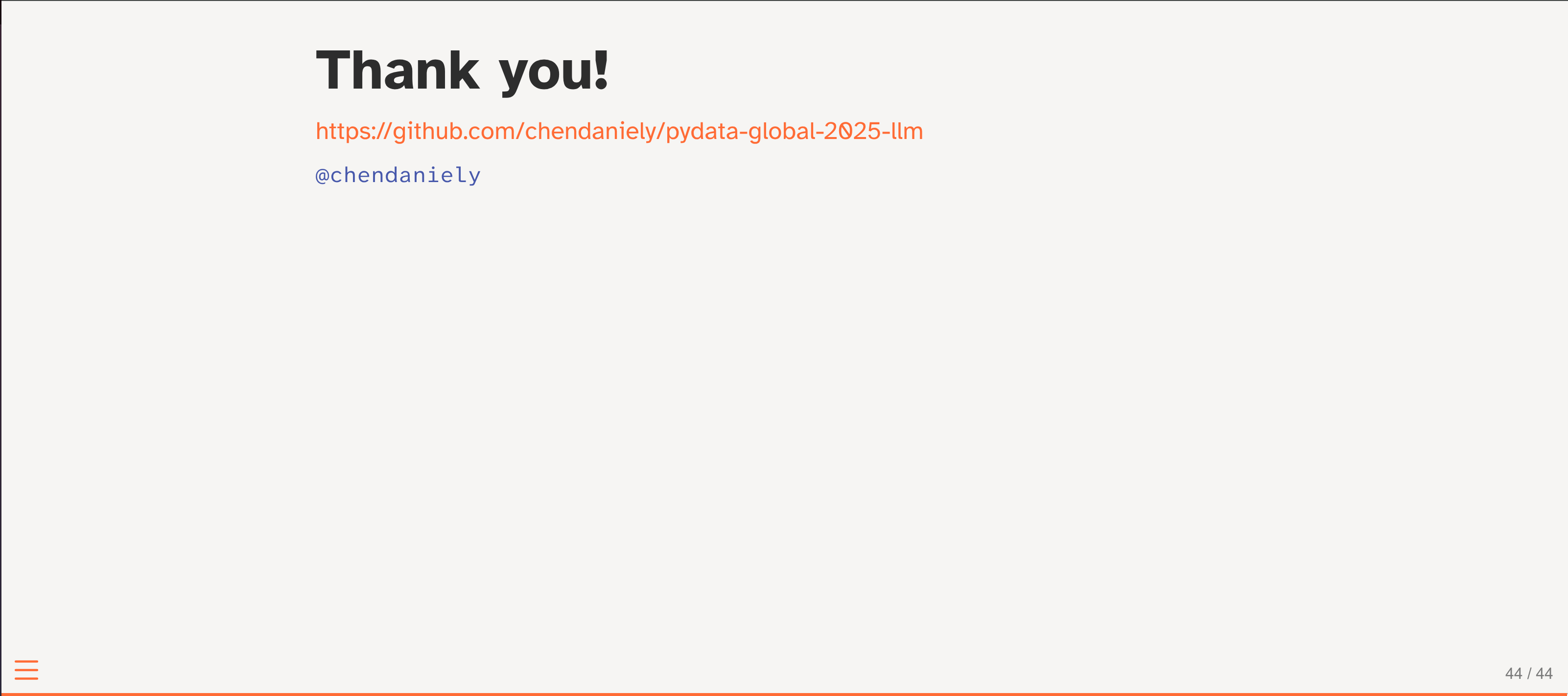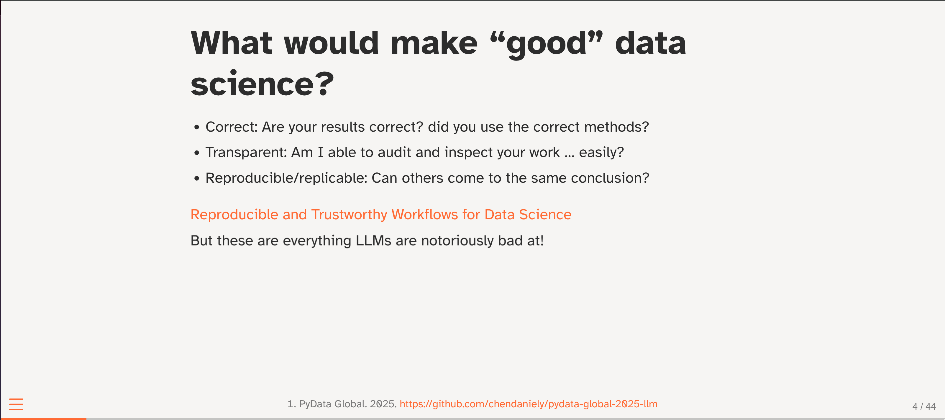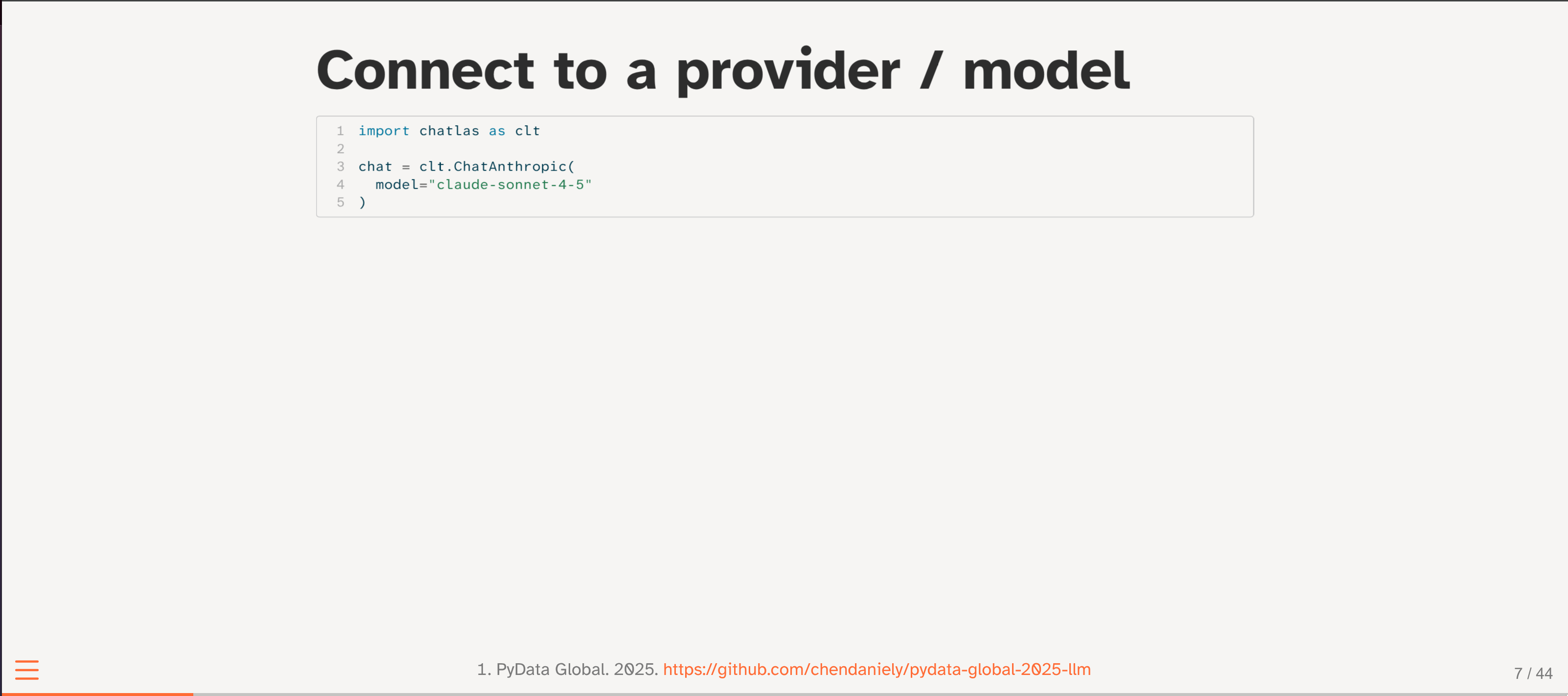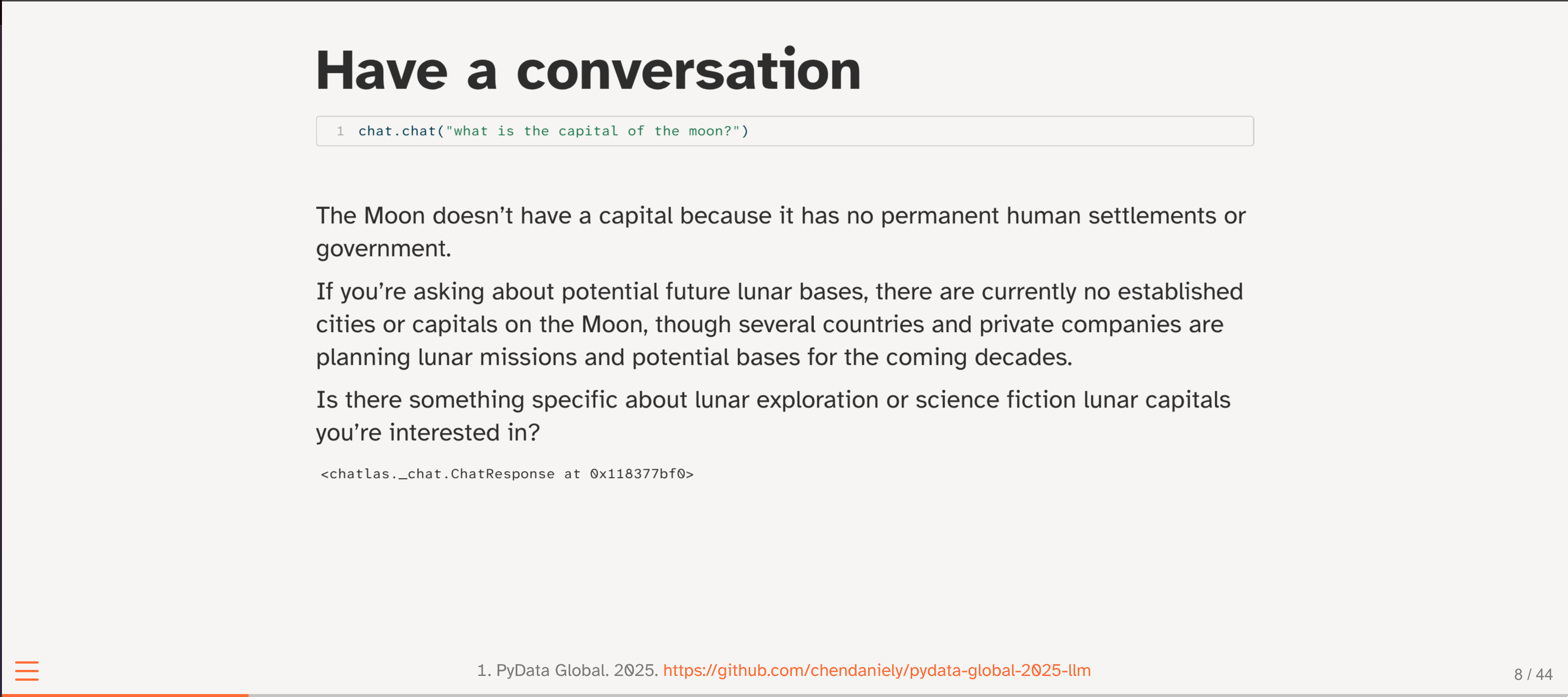 As a shiny user I have been planning to learn and use this chatlas package for a while, and this talk provided a great introduction to it. I liked the way Daniel Chen explained both the strengths and weaknesses of LLMs in data science contexts, and how to leverage their strengths while mitigating their weaknesses. The live demo of integrating Chatlas into a Shiny dashboard was particularly helpful, as it showed practical steps to create an AI-powered data product. Overall, this talk clarified how to responsibly use LLMs in my data science work.