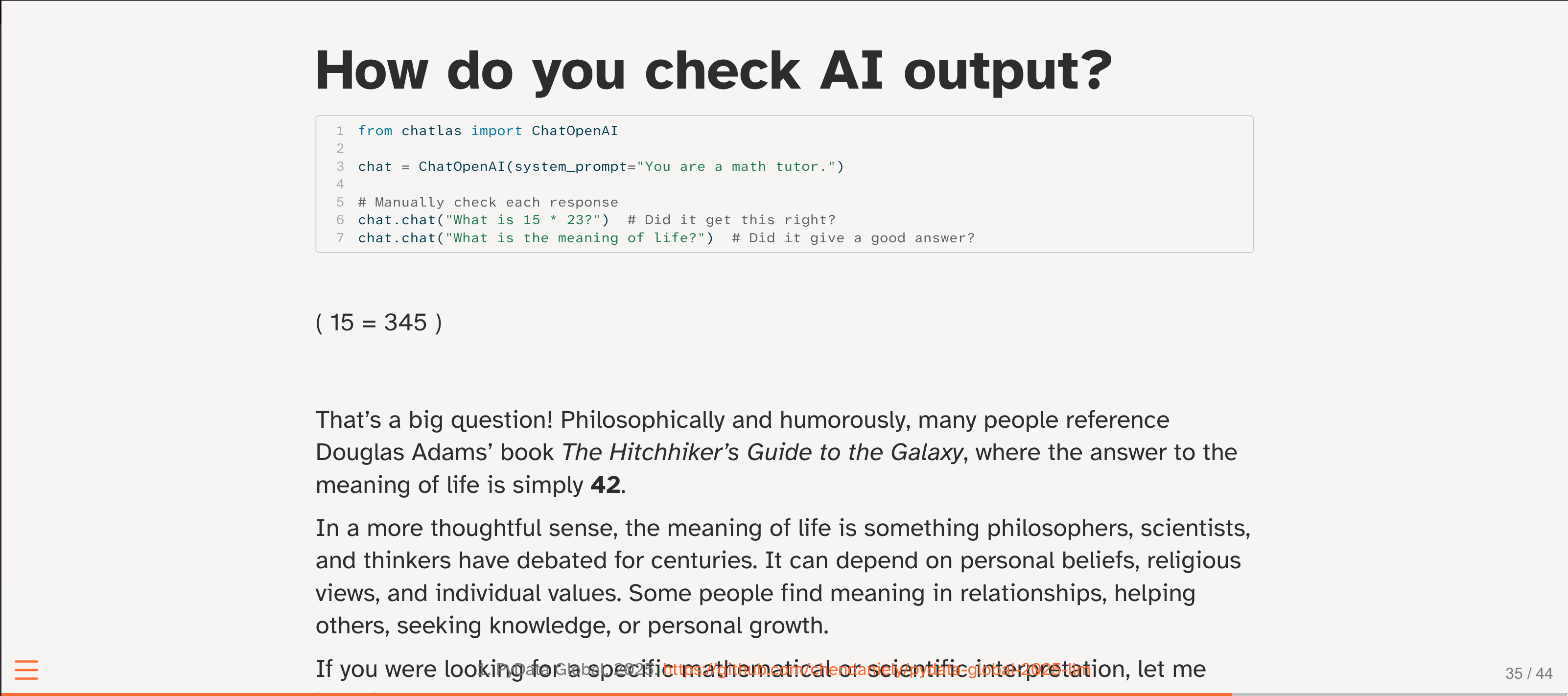 LLMs have a lot of hype around them these days. Let’s demystify how they work and see how we can put them in context for data science use. As data scientists, we want to make sure our results are inspectable, reliable, reproducible, and replicable. We already have many tools to help us in this front. However, LLMs provide a new challenge; we may not always be given the same results back from a query. This means trying to work out areas where LLMs excel in, and use those behaviors in our data science artifacts. This talk will introduce you to LLms, the Chatlas package, and how they can be integrated into a Shiny to create an AI-powered dashboard. We’ll see how we can leverage the tasks LLMs are good at to better our data science products.