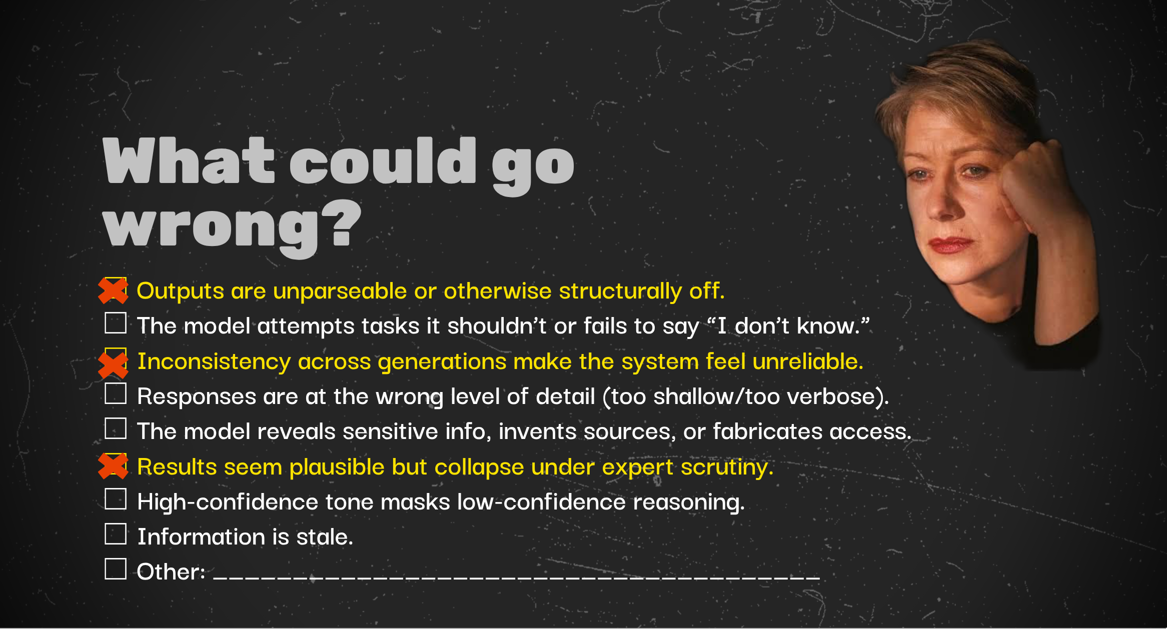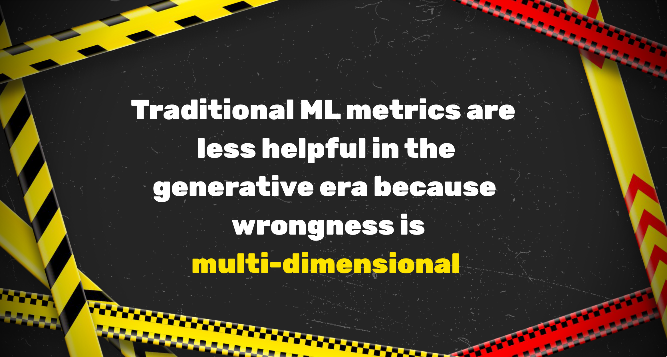- Metrics of the past and why they aren’t as useful now (~5 min) Common failure modes when attempting to evaluate generative AI outputs and other unlabeled data (~8 min)
