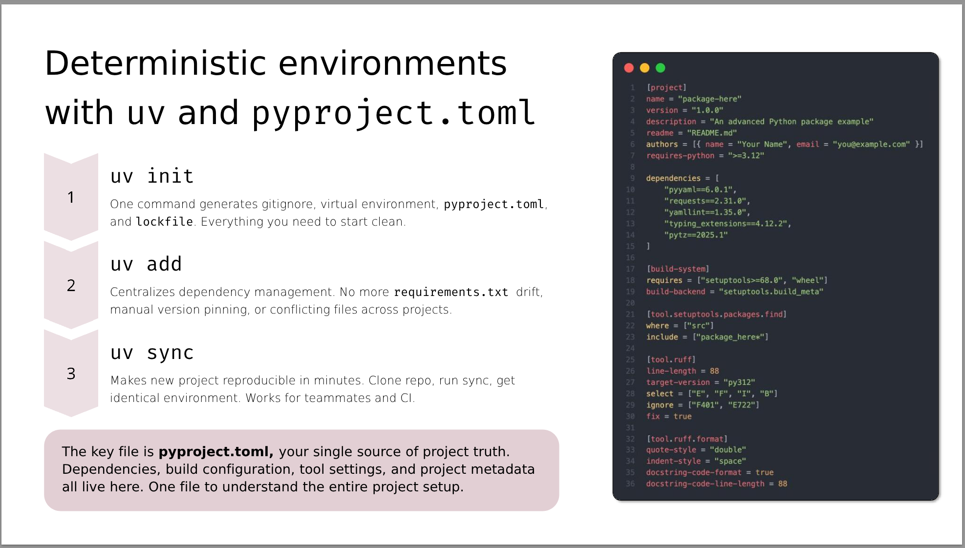 This talk isn’t a showcase of cutting-edge libraries. It’s a field guide on how to leverage modern Python tools and fostering repeatable software engineering habits to maximize value delivery.