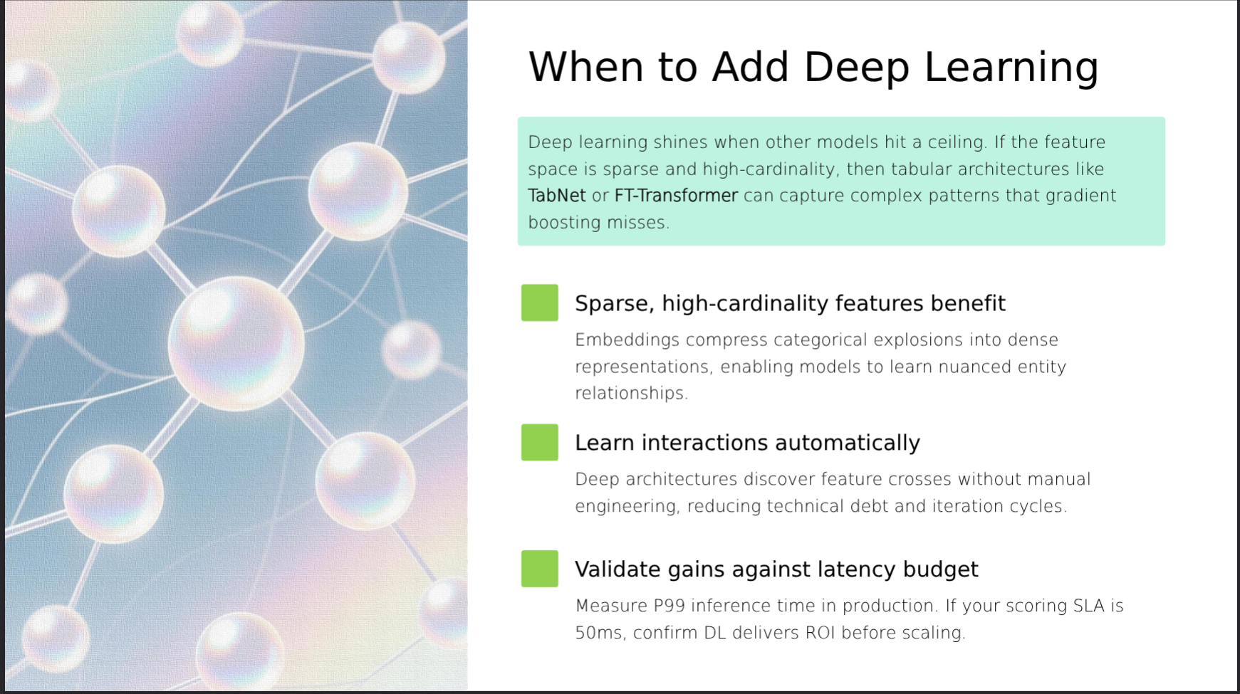 Modeling under latency budgets: Where XGBoost shines, when to add tabular DL, injecting graph signals without blowing latency (simple handcrafted graph stats + GNNs).