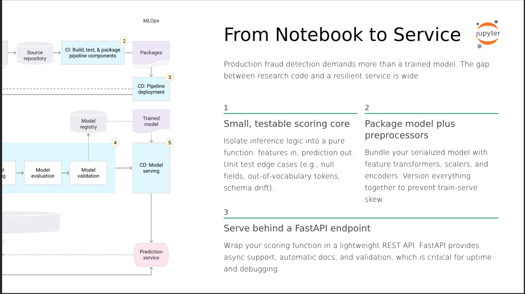 From notebook to service: Small, testable core, FastAPI endpoint, thresholds and shadow mode, alert quotas, analyst feedback loops.