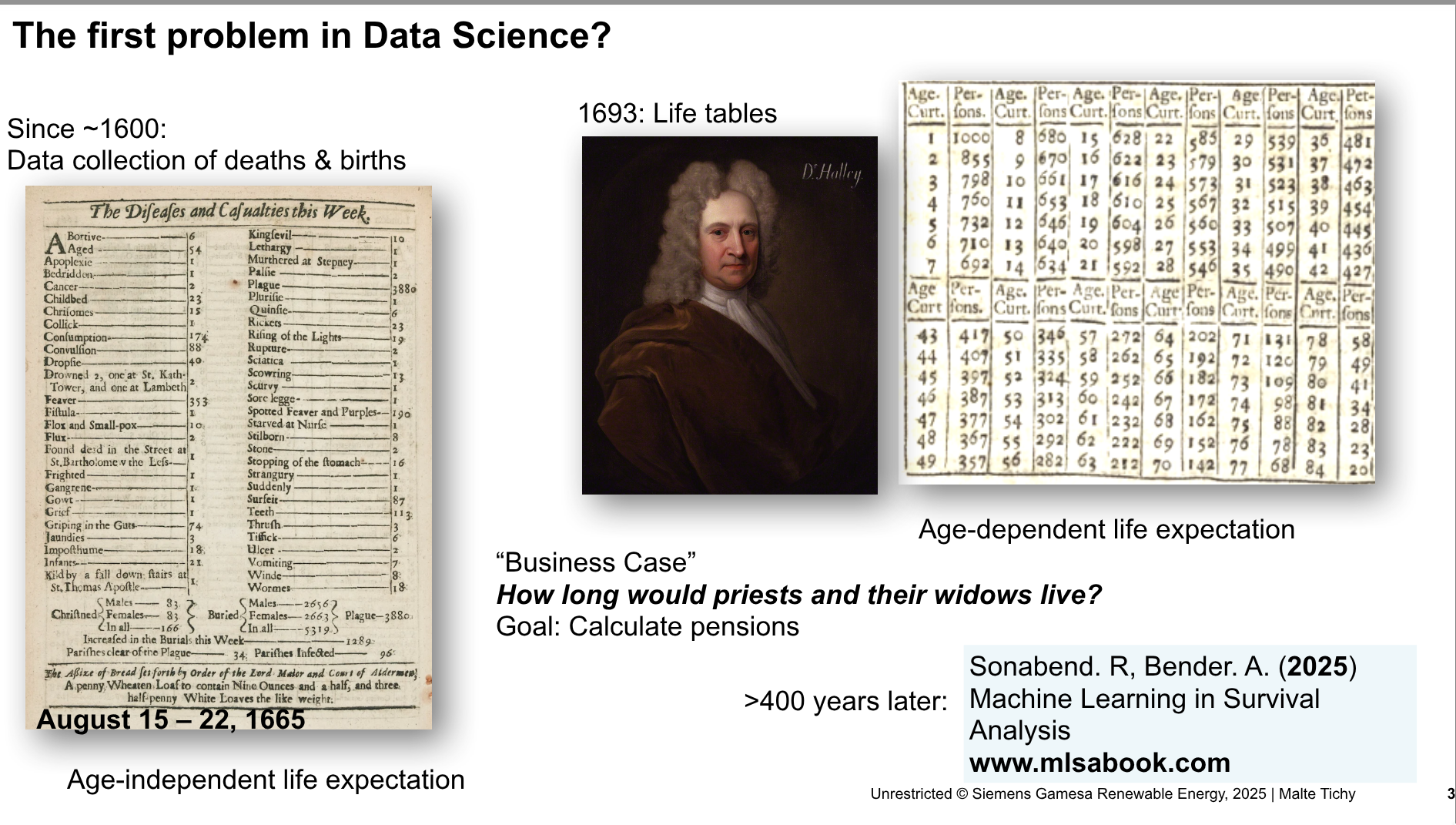 In Survival analysis tackles one of the oldest and most universal questions in data science: Can we learn from the past when something will happen in the future? I will introduce you to the core concepts of survival analysis, visualize time-to-event datasets with python and R, and introduce pertinent probability distributions. Classical analysis methods for fitting such datasets - some developed long before the age of modern computing - will be confronted to machine-learning approaches. Along the way, surprising paradoxes and counterintuitive results will reveal why survival analysis is not merely a blend of regression and classification, but an important prediction problem of its own.