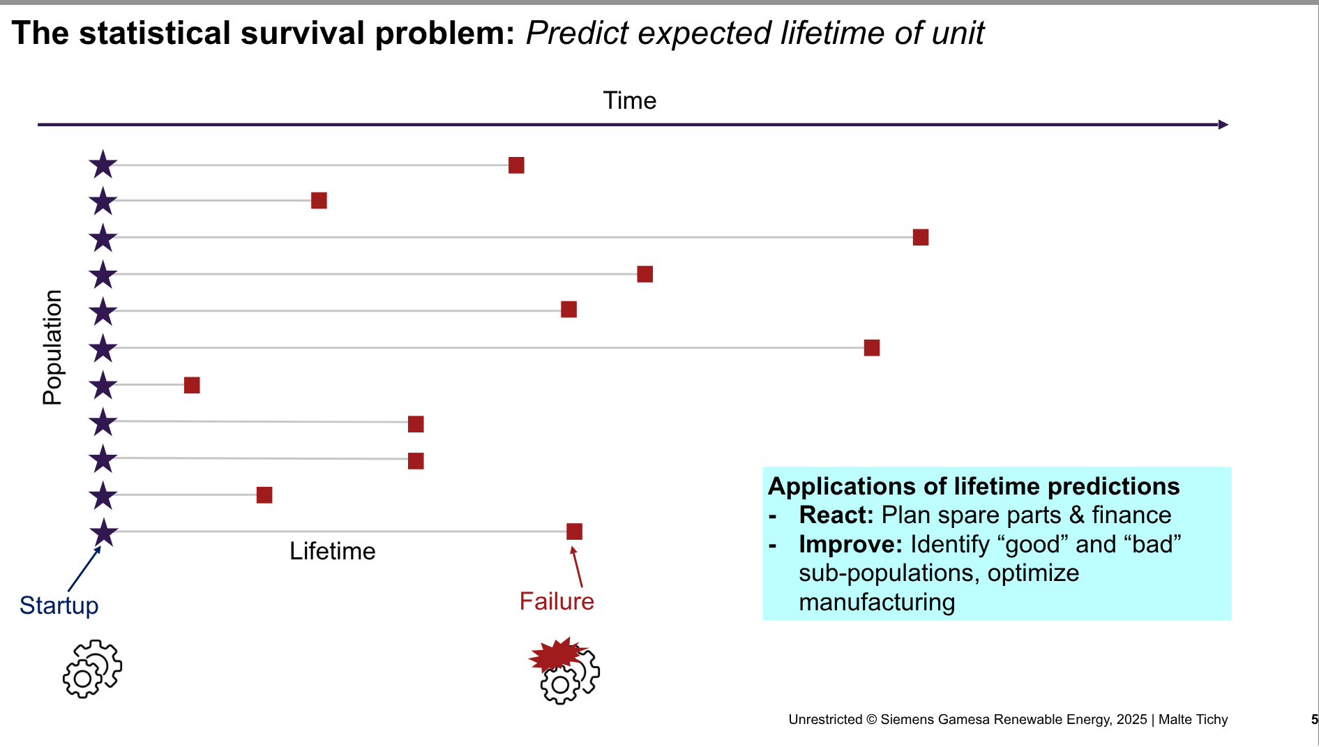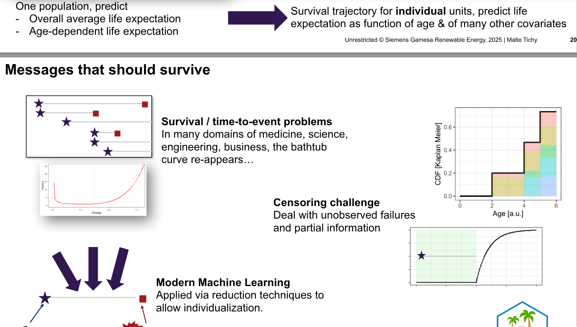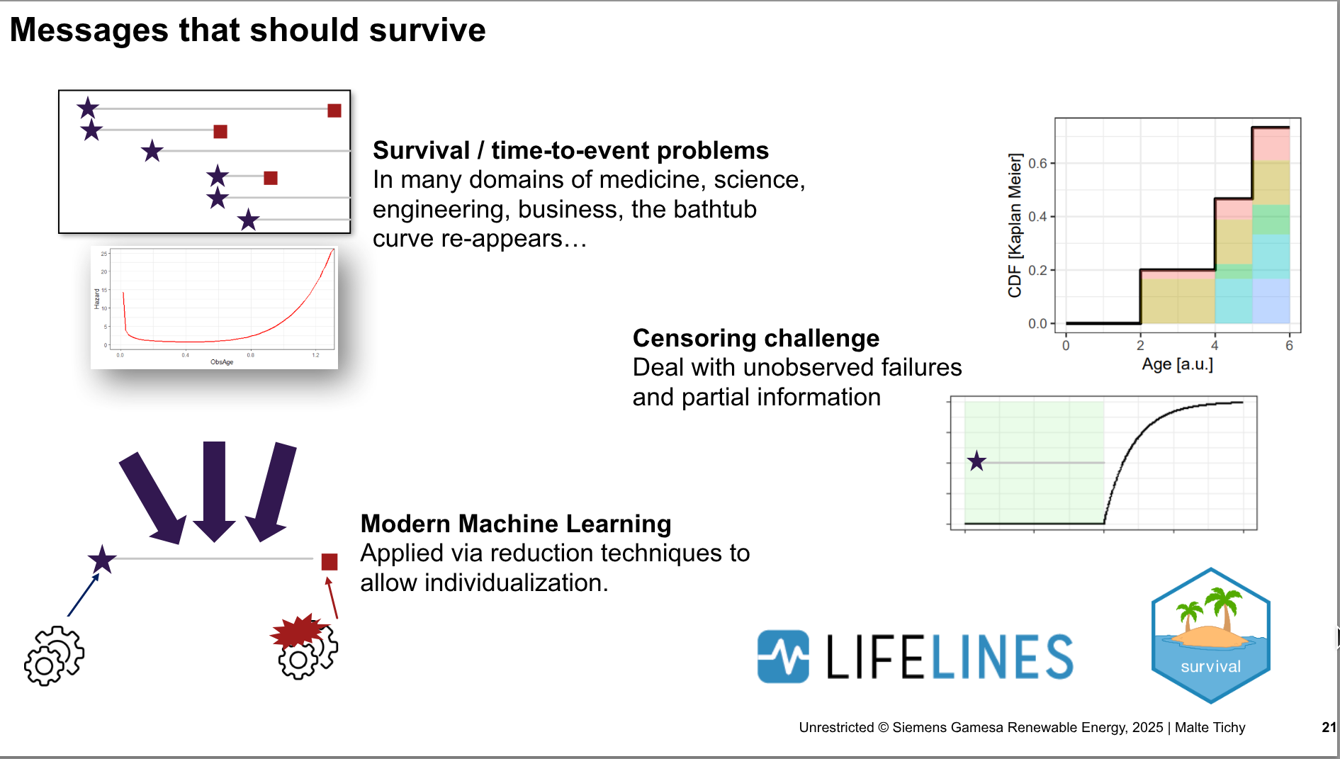 I therefore want to give the audience, who does not need to have heard of survival analysis before, an impression about what survival analysis is about, what one needs to be careful with, and which analytical and computational tools to use to get to reliable predictions. In a step-by-step constructive approach, I will slowly guide the audience from the simplest flavor of the fully observed time-to-event-problem to the more intricate versions that include censoring and truncation, in which managing one’s own ignorance becomes the most important and challenging aspect. Numerous code examples in python and R will make the talk hands-on, and allow listeners to replicate the numerical experiments and visualizations. At the same time, I will constantly recur to lucid everyday-examples (what age should the house that you buy have so you avoid problems? how long can you use your winter tires on your car? why is milk often still good after the best-before date?) - and thereby hopefully convince the audience: Survival analysis is almost always everywhere.