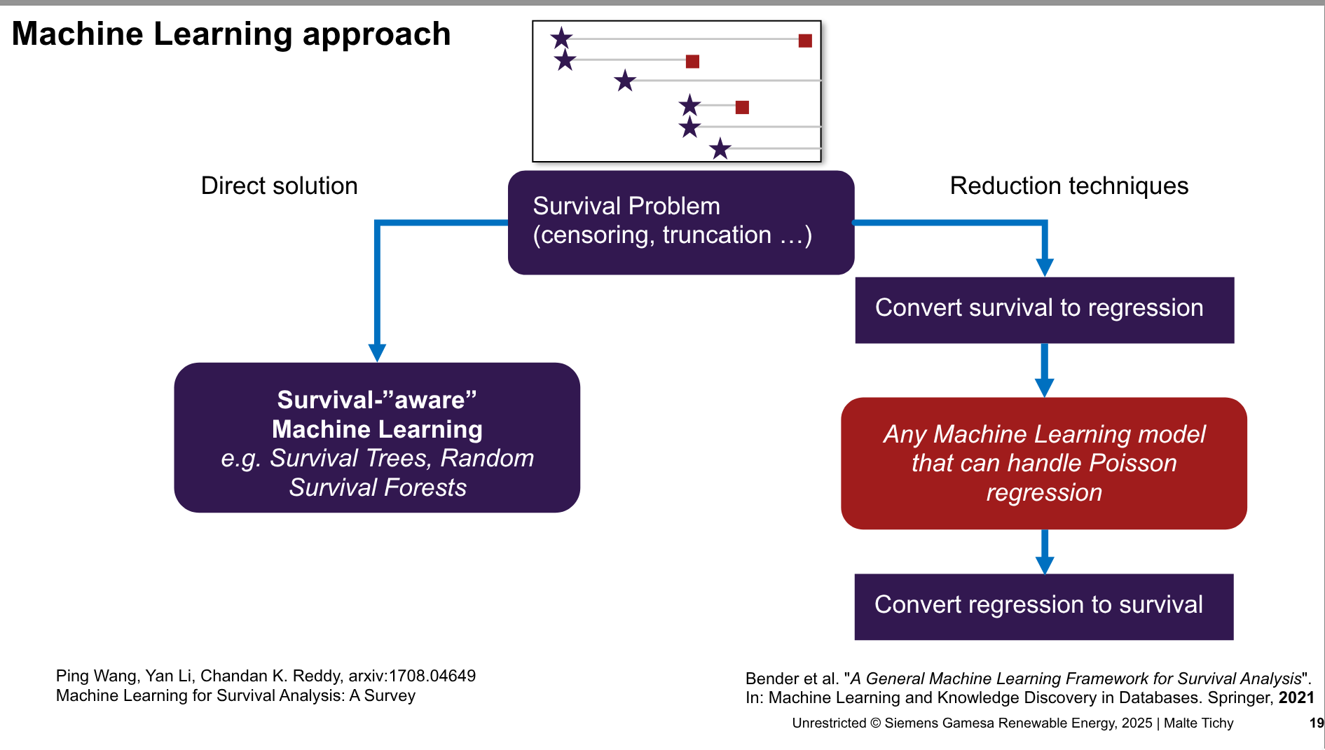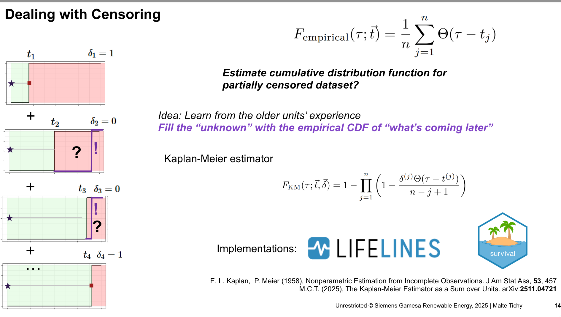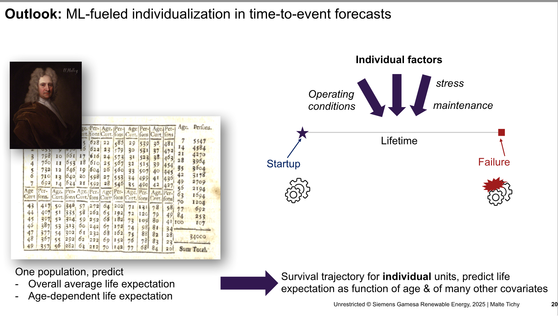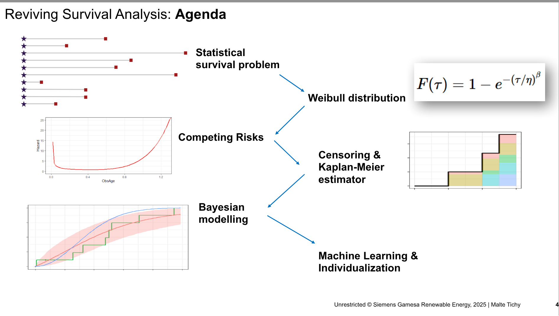 I therefore want to give the audience, who does not need to have heard of survival analysis before, an impression about what survival analysis is about, what one needs to be careful with, and which analytical and computational tools to use to get to reliable predictions. In a step-by-step constructive approach, I will slowly guide the audience from the simplest flavor of the fully observed time-to-event-problem to the more intricate versions that include censoring and truncation, in which managing one’s own ignorance becomes the most important and challenging aspect. Numerous code examples in python and R will make the talk hands-on, and allow listeners to replicate the numerical experiments and visualizations. At the same time, I will constantly recur to lucid everyday-examples (what age should the house that you buy have so you avoid problems? how long can you use your winter tires on your car? why is milk often still good after the best-before date?) - and thereby hopefully convince the audience: Survival analysis is almost always everywhere.