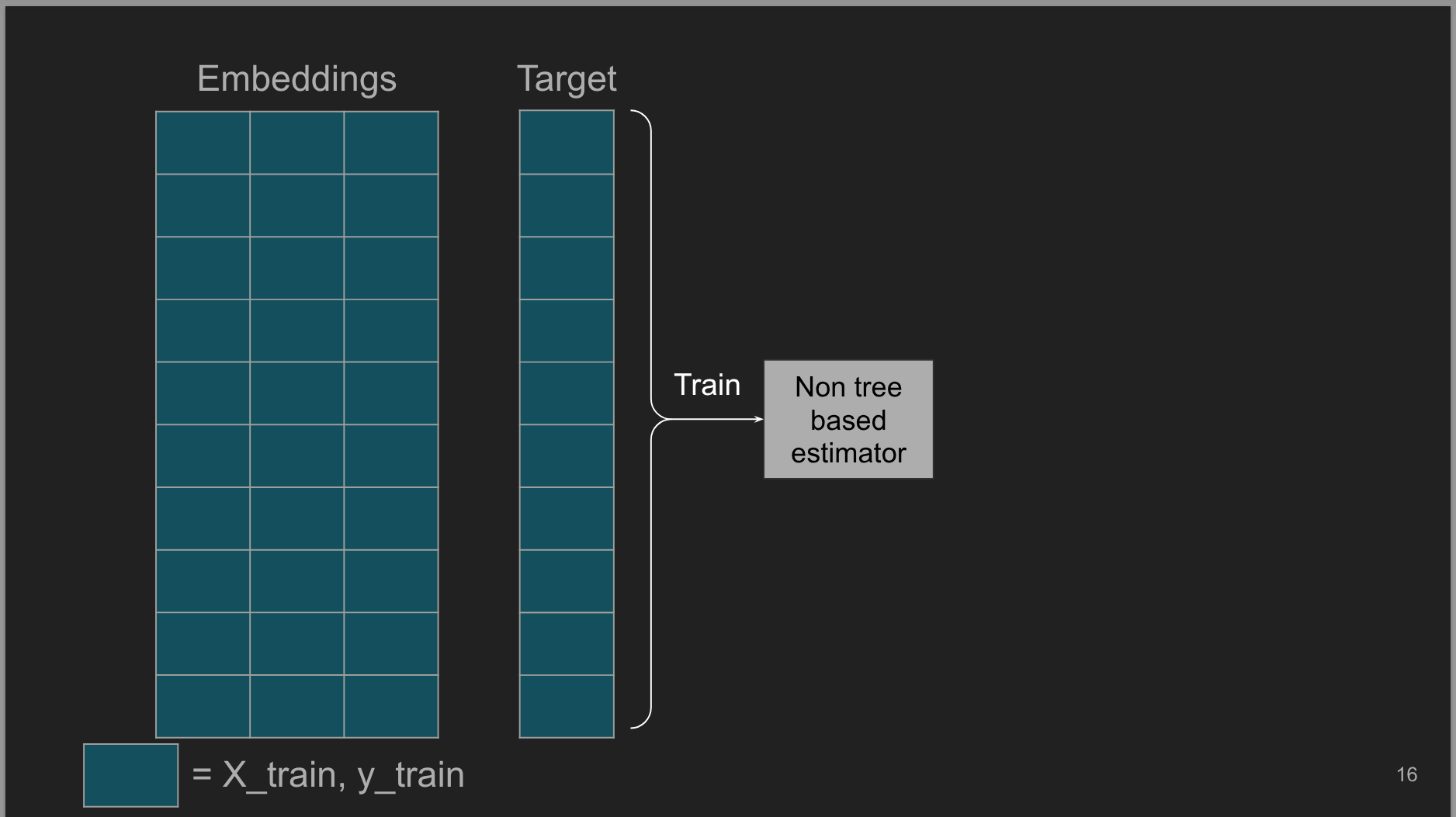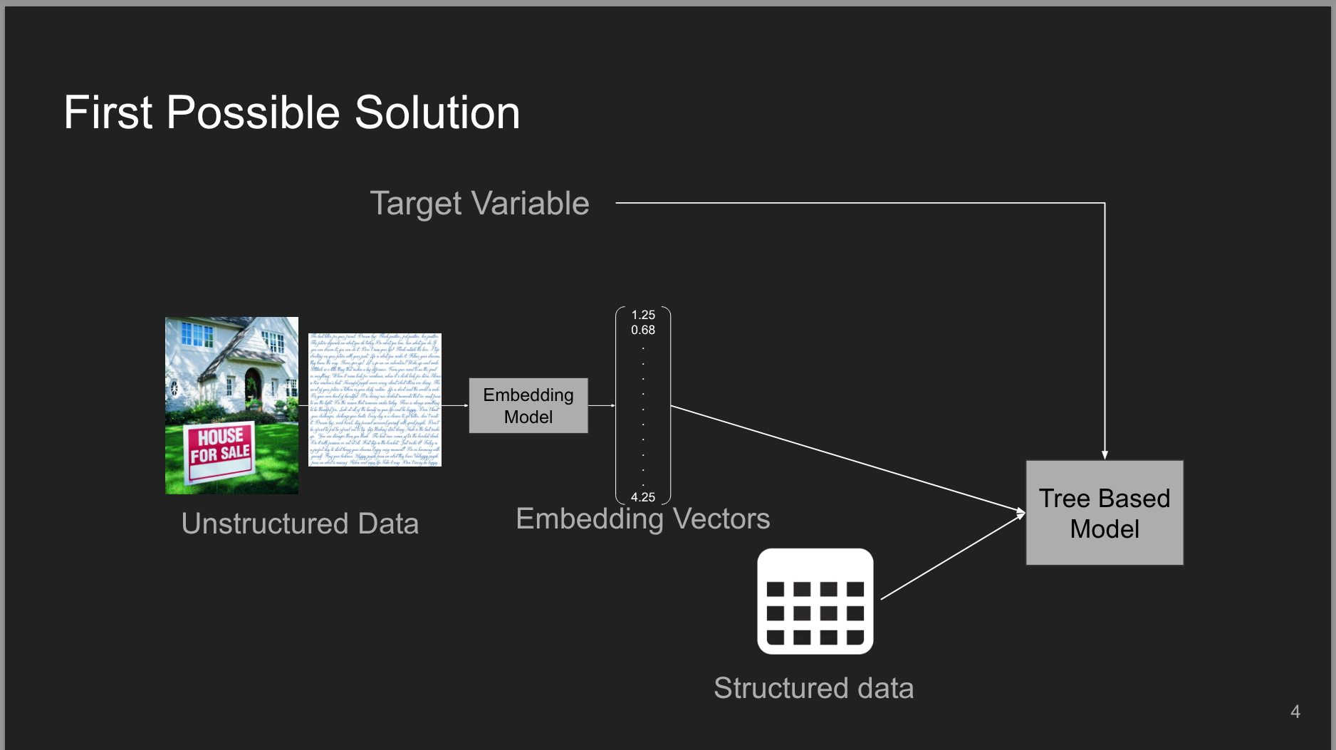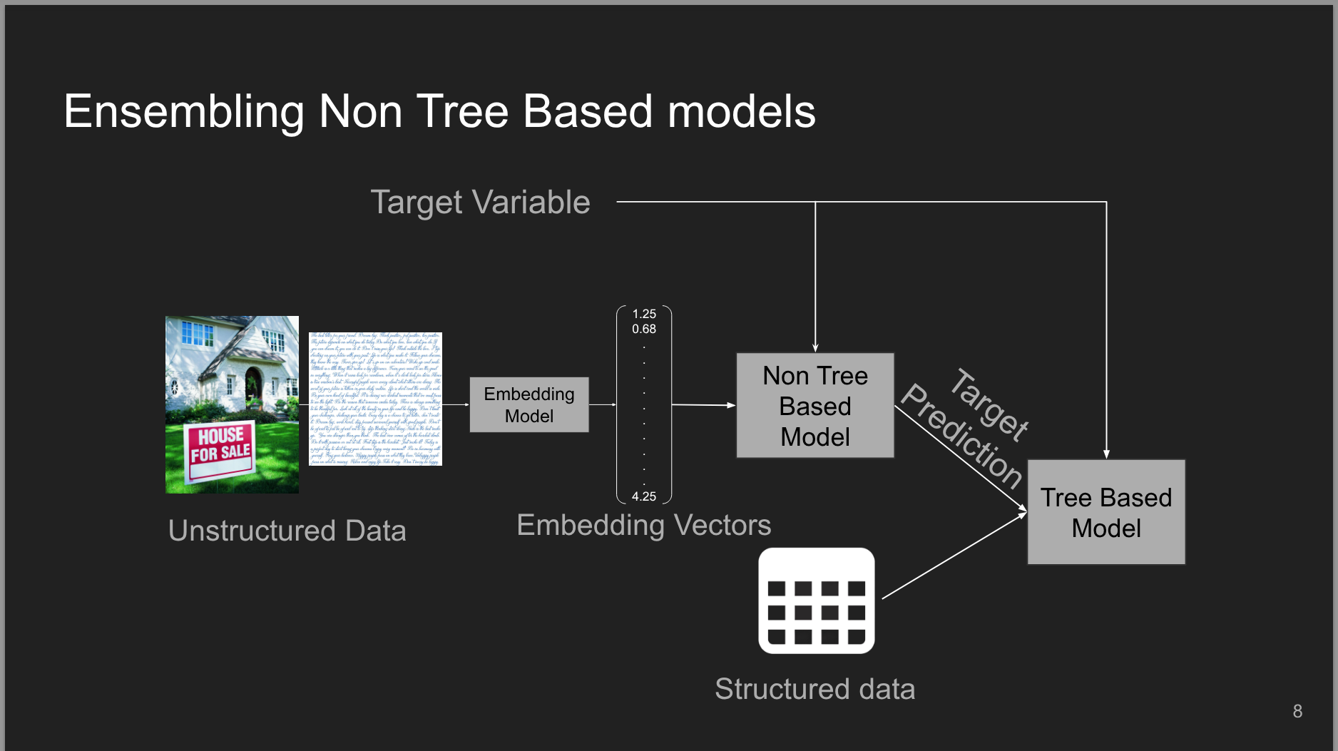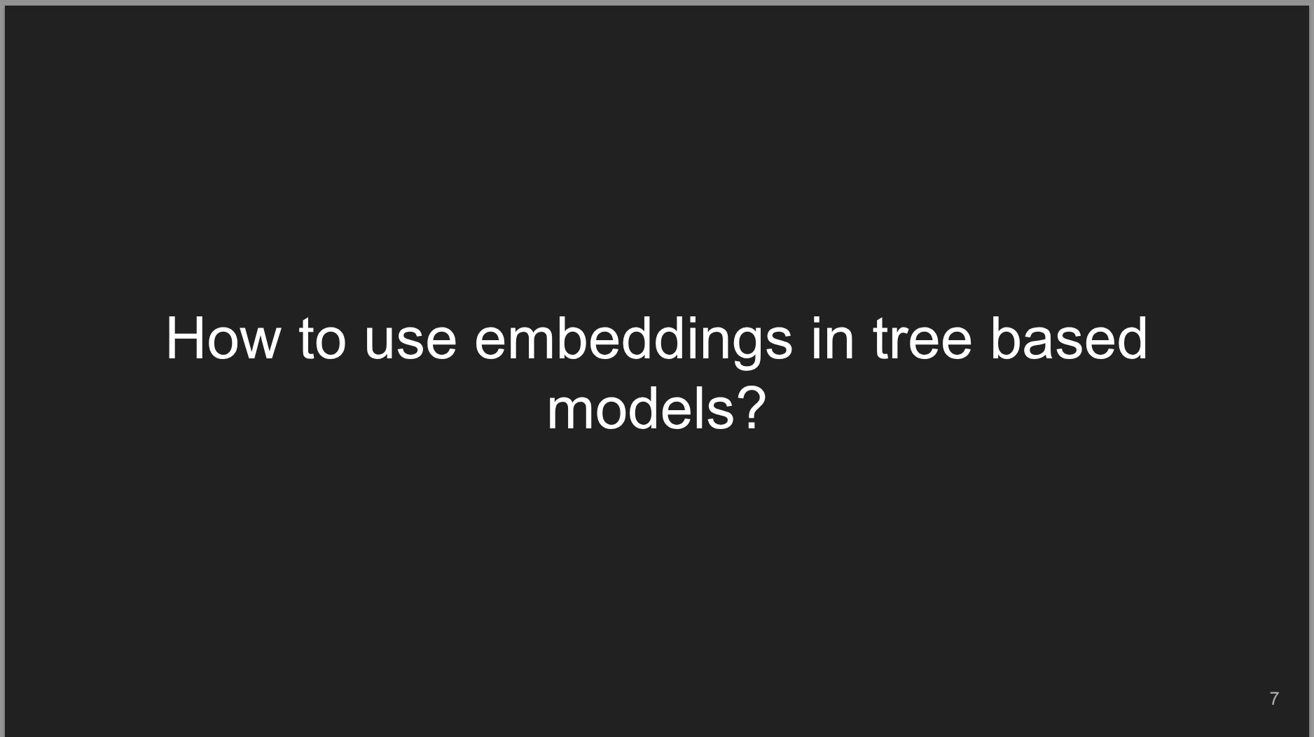 - 5 minutes Explanation of how can we leverage non-tree based models to transform text embeddings into a format that tree based models can effectively use.