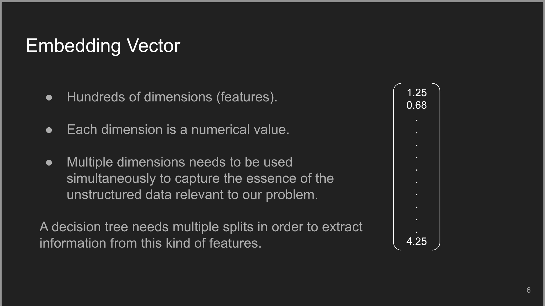 - 5 minutes Overview of text embeddings, how tree-based models are built, and the challenges they face with text embeddings compared to linear models.