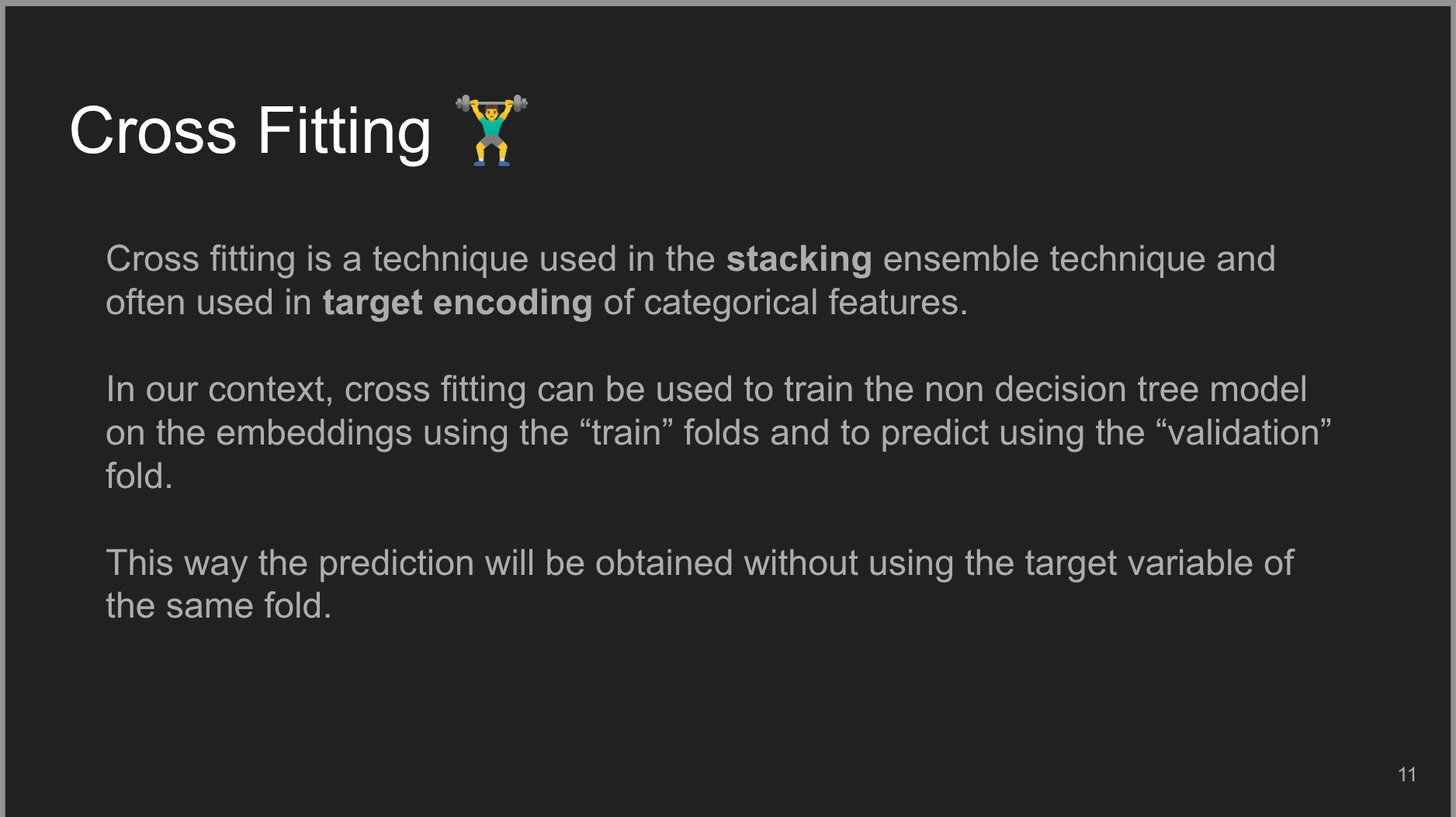 - 5 minutes Explanation on cross-fitting, a technique used to avoid target leakage when generating features using the target variable.