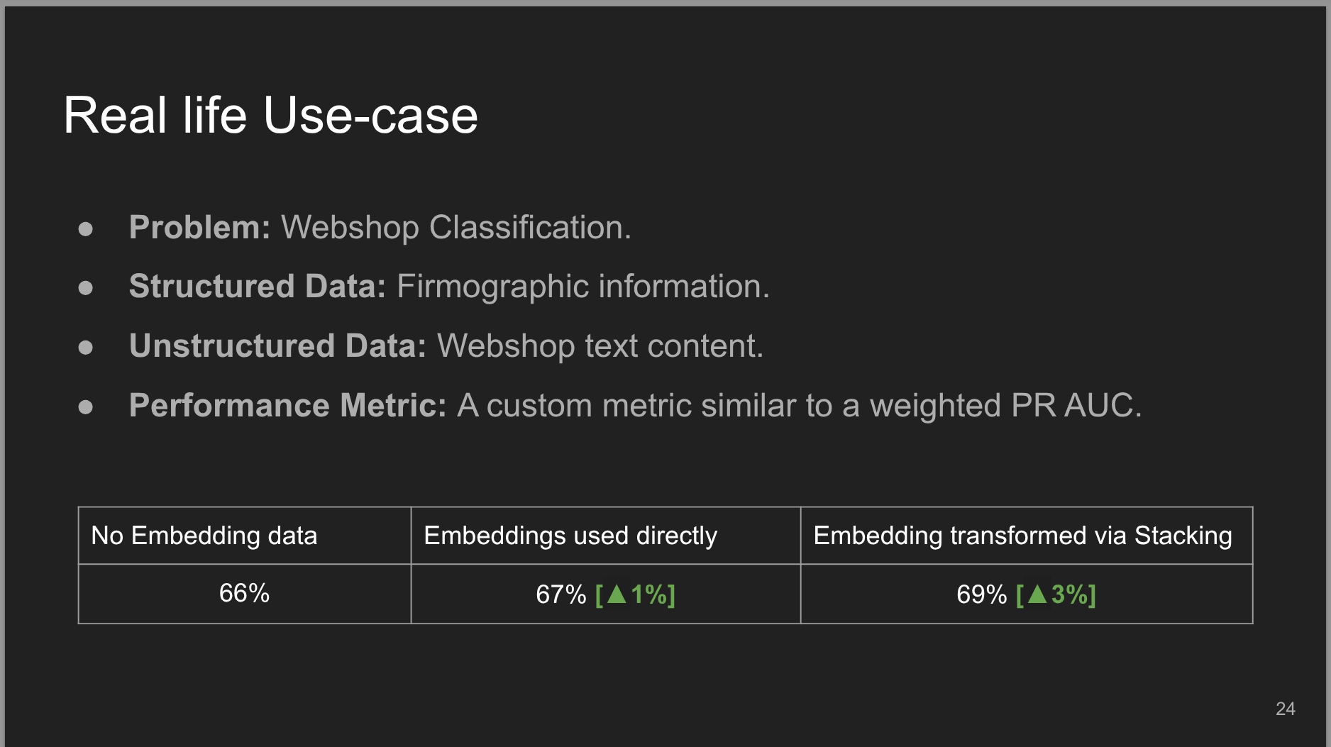 The presentation is aimed at Data Science and Machine Learning practitioners who are already familiar with tree-based models and want to learn how to effectively incorporate text embeddings features to boost the performances of their models.
