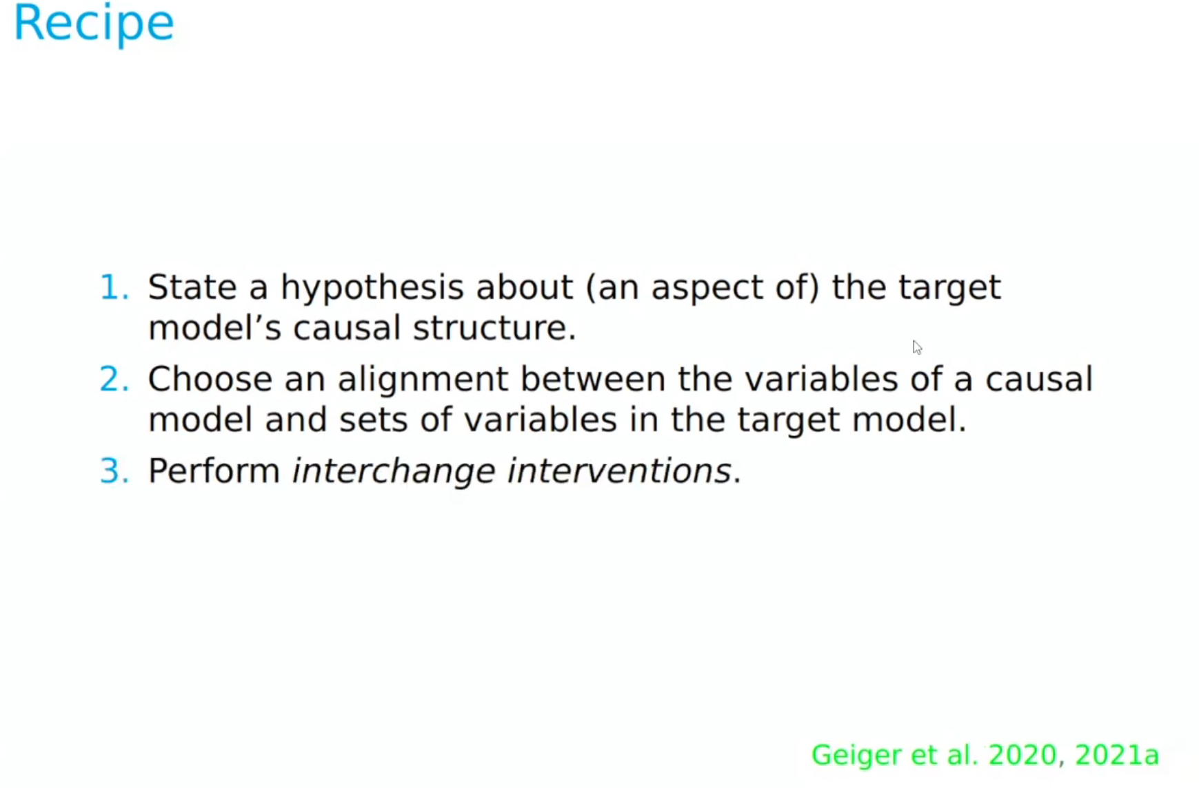 The interchange intervention is to take the intermediate representation of a network on one input, and then feed it into the rest of the network with a different input and see if the output is what we expect. If the network is doing what we think it is doing, then the intervention should result in a predictable output. (we may have swapped z mid way through the network and gotten the corresponding output etc.) Alternatively we our hypothesis may be wrong and we may have to try many different interventions untill we can uncover the true (causal) structure of the network