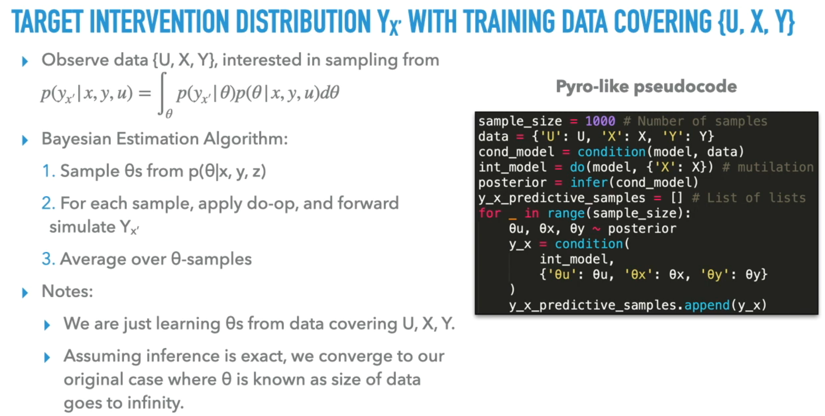 - Handling Unknown Parameters and Latent Variables: The presentation addresses how to handle cases where parameters of conditional distributions are unknown, treating them as random variables. It also discusses the challenges of causal inference when latent variables are present, particularly regarding identifiability .
