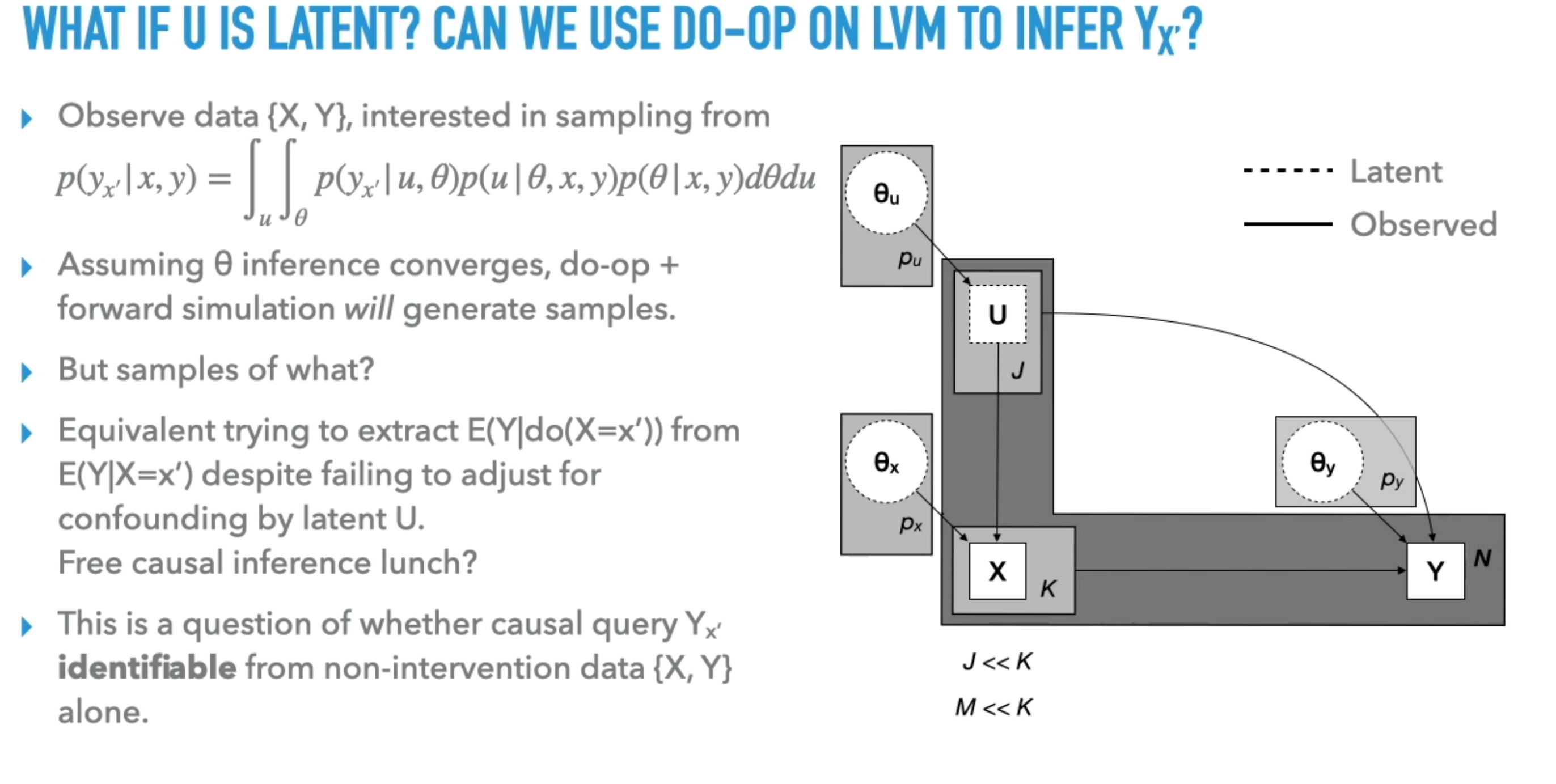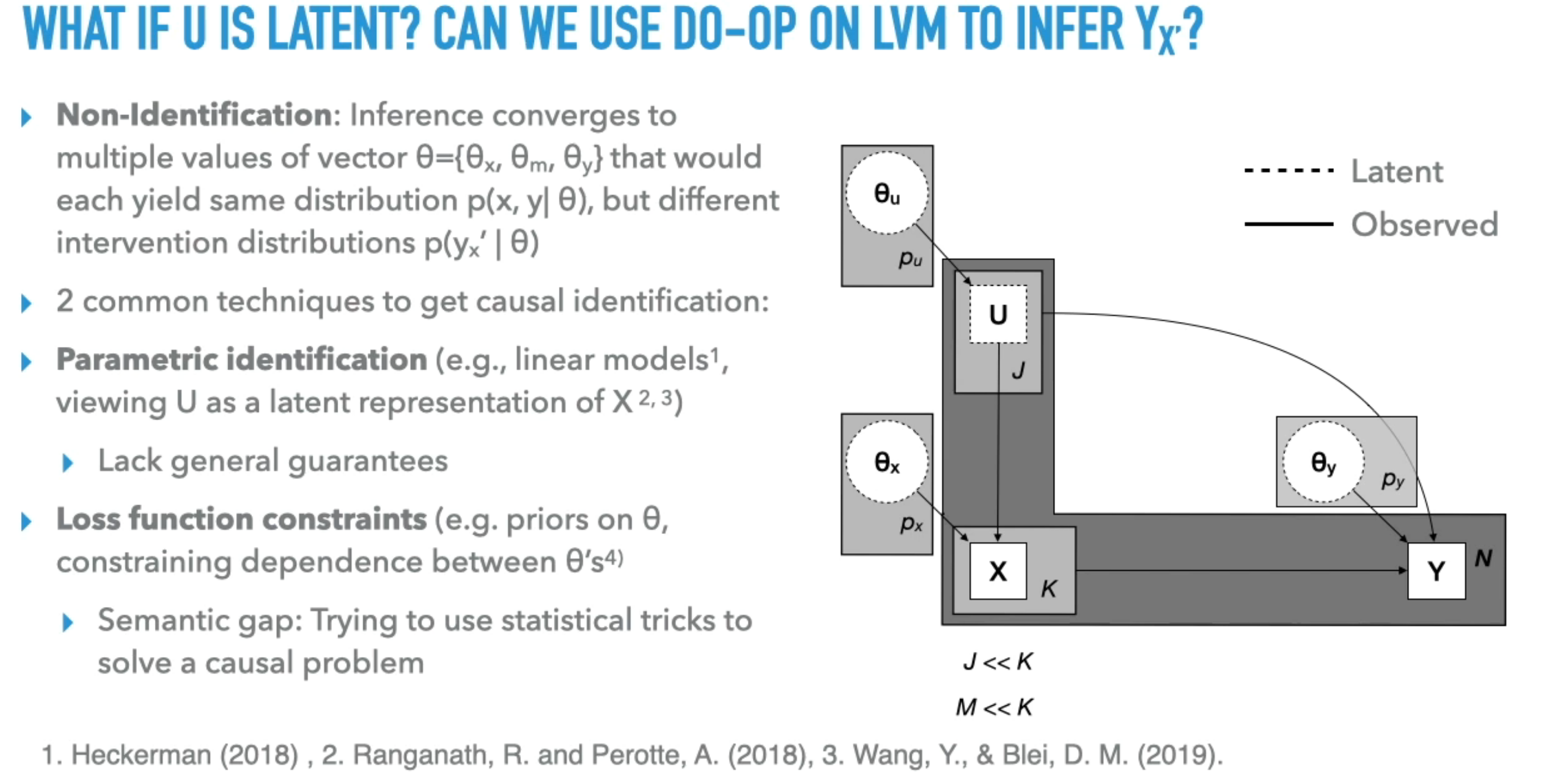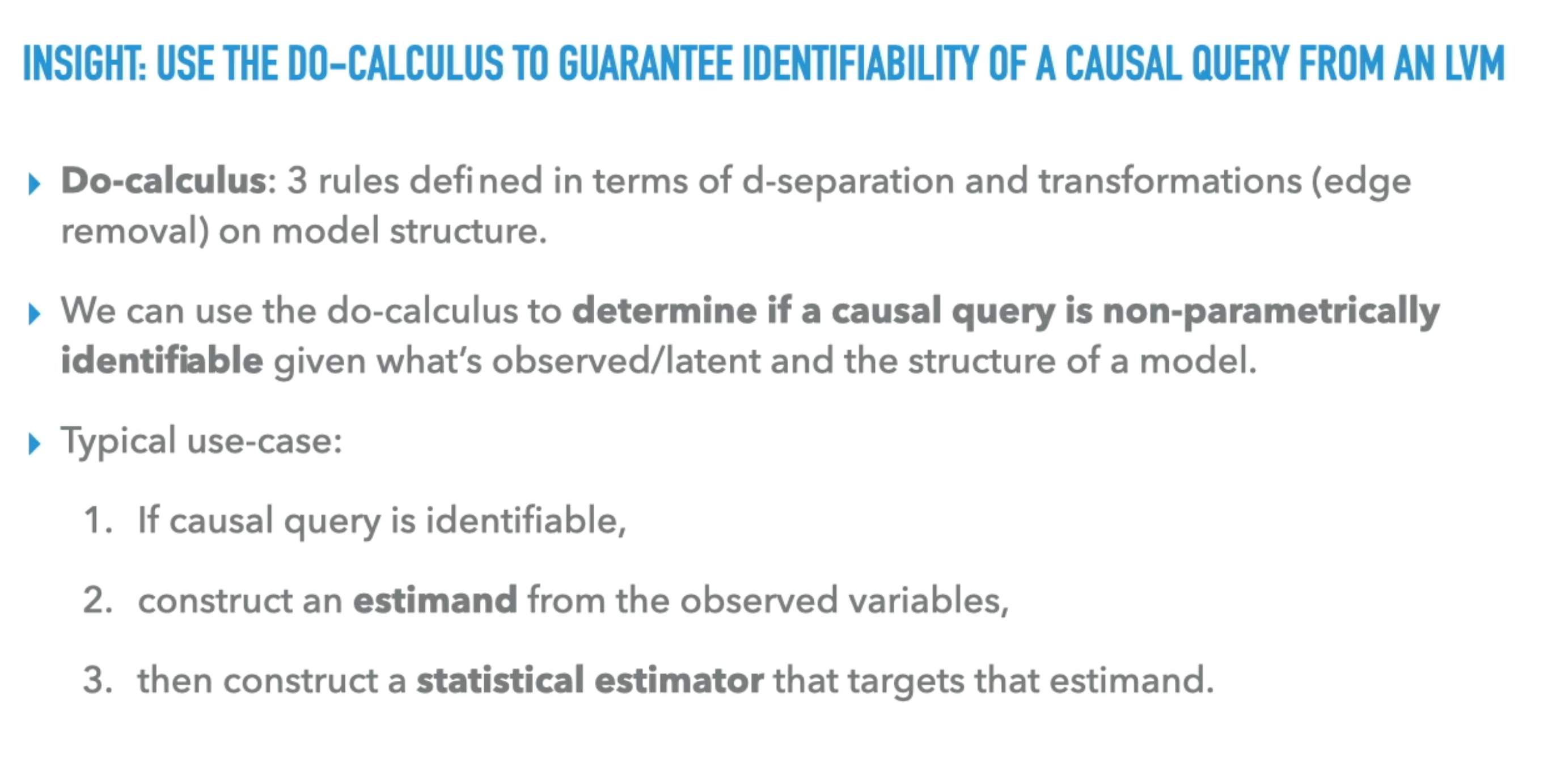 - Do-Calculus for Identifiability: The speaker proposes using the do-calculus to guarantee the identifiability of causal queries in latent variable models . The do-calculus provides rules based on d-separation and model structure transformations to determine if a causal query is non-parametrically identifiable .
