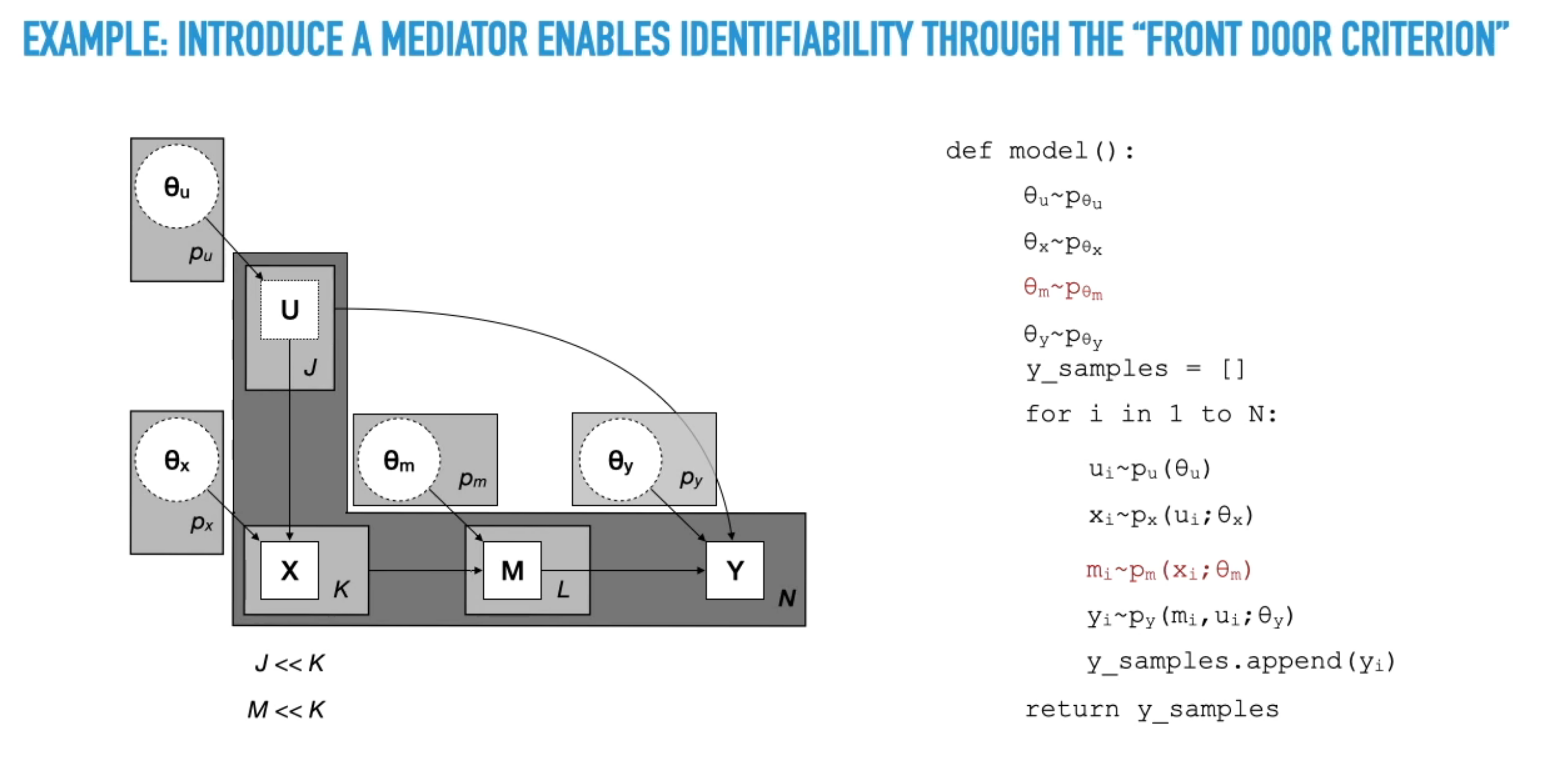 - Front-Door Criterion Example: A concrete example is provided using the “front-door criterion,” where adding an intermediate variable (mediator) between two variables makes the model identifiable according to the do-calculus.