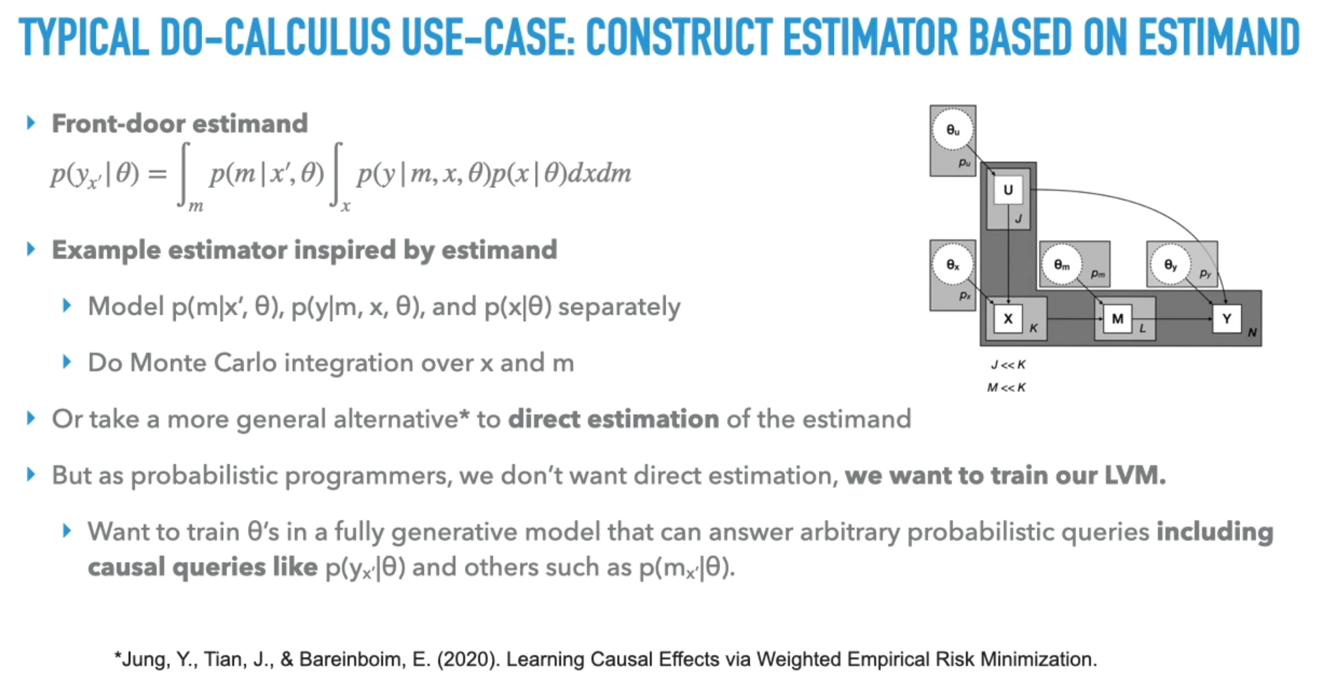 - Estimator for Causal Query: The video concludes by arguing that if a model correctly represents the joint probability of observed variables and has do-calculus identifiability for a given causal query, then the trained theta, do-operation, transformation, and simulation procedure can serve as an estimator for that causal query.