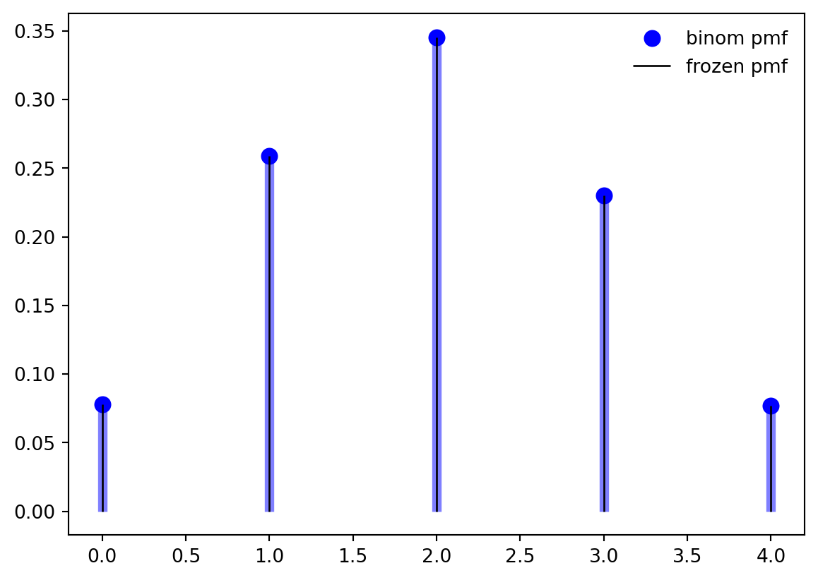 ax.vlines(x, 0, rv.pmf(x), colors='k', linestyles='-', lw=1,