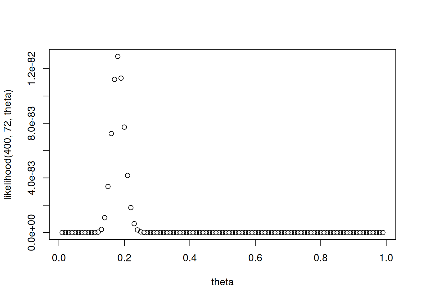 plot(theta, likelihood(400, 72, theta))You can also do this with log likelihoods. This is typically more numerically stable to compute