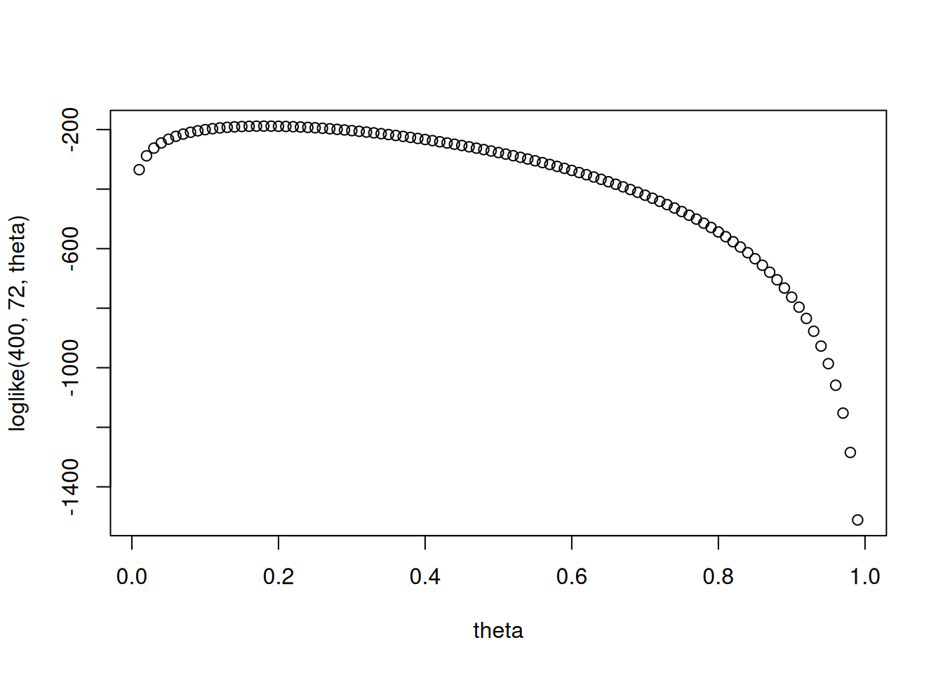 plot(theta, loglike(400, 72, theta))Having these plotted as points makes it difficult to see, let’s plot it as lines