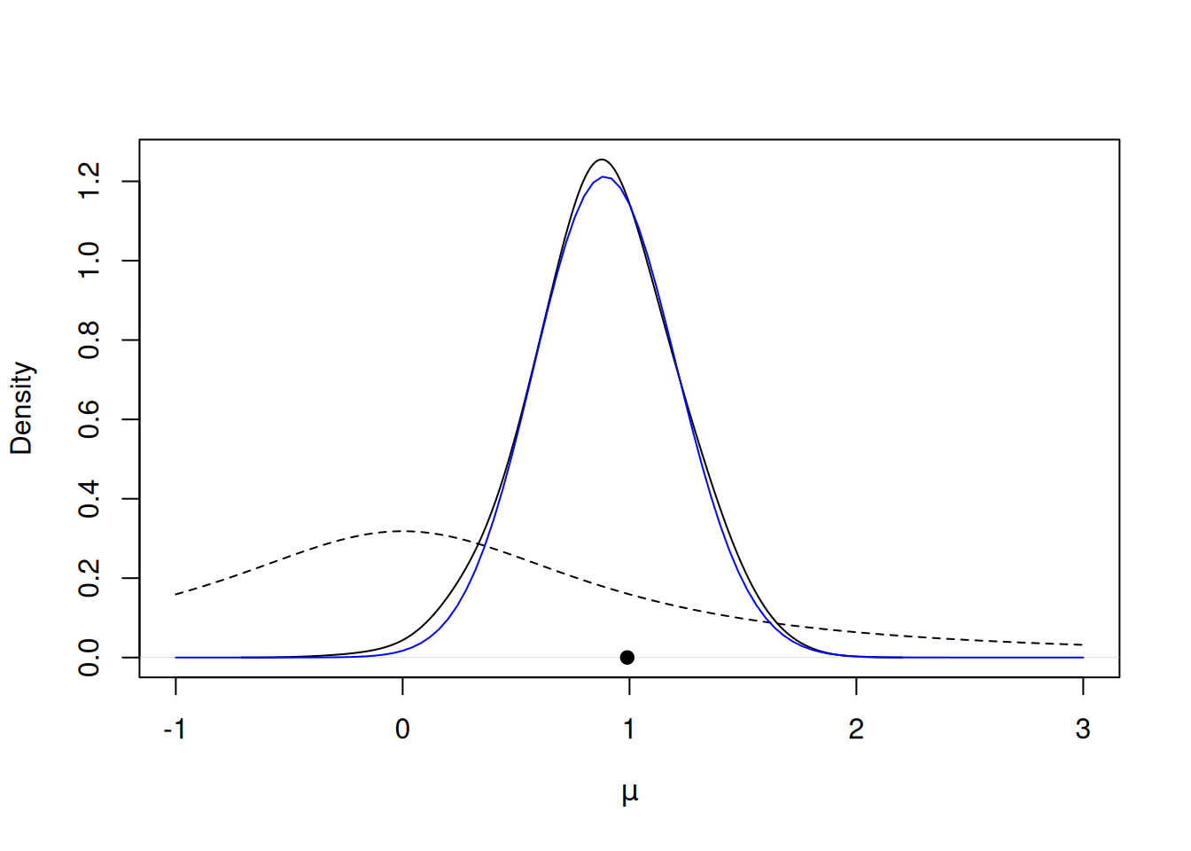 curve(dt(x=x, df=1), lty=2, add=TRUE) # prior for mu