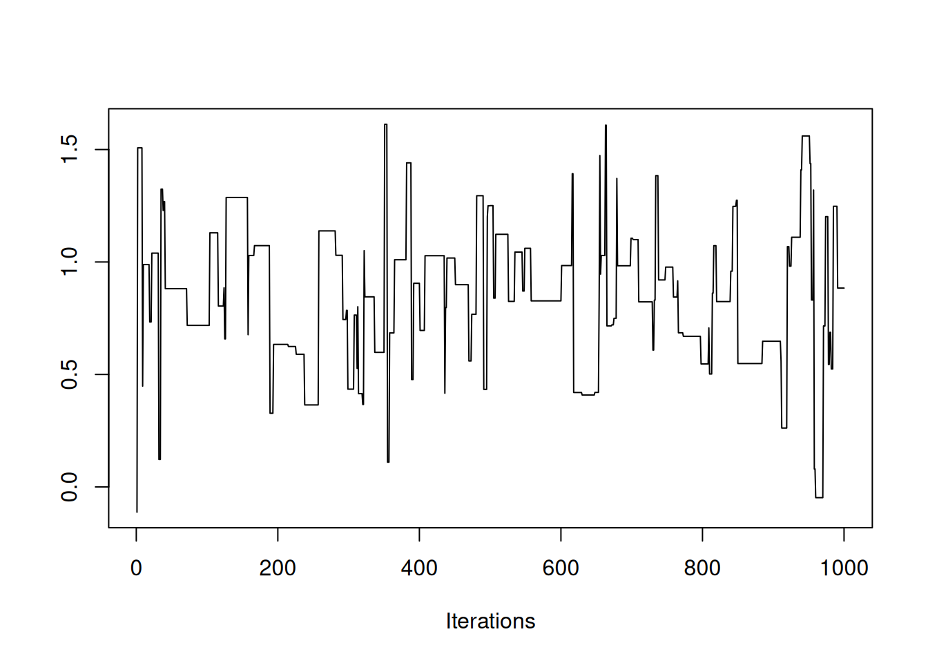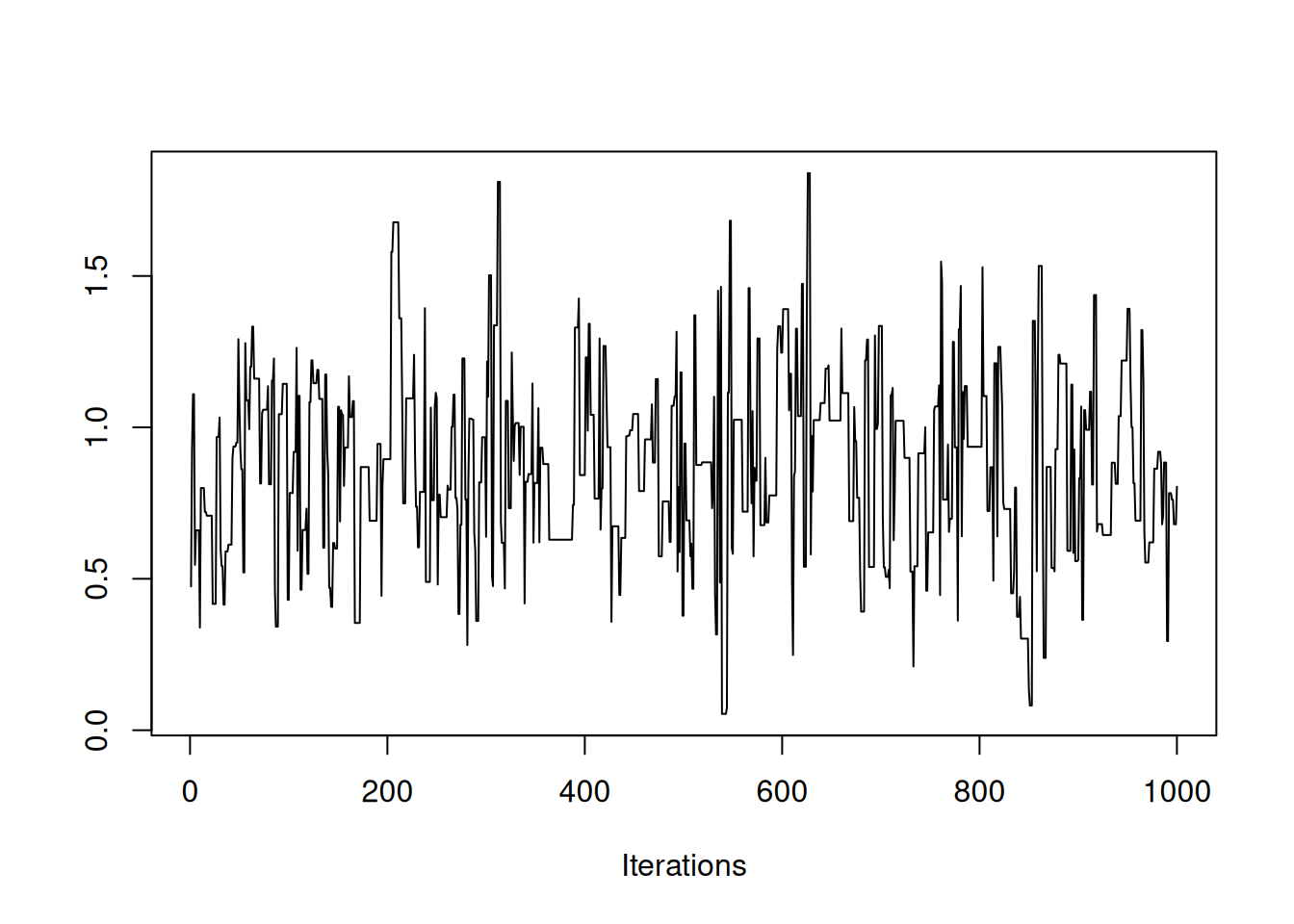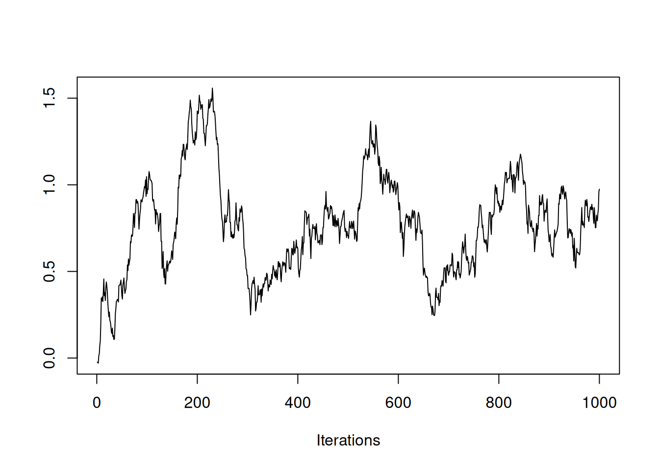 This last plot is called a trace plot. It shows the history of the chain and provides basic feedback about whether the chain has reached its stationary distribution.