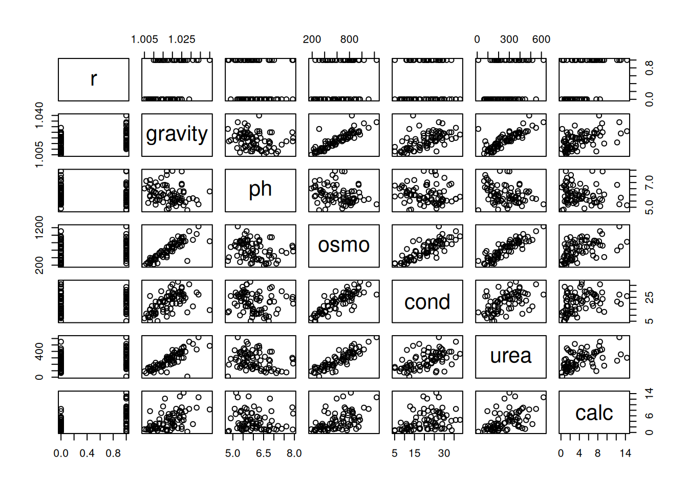 For an example of logistic regression [**logistic regression**]{.column-margin}, we'll use the urine data set from the `boot` package in `R`. The response variable is `r`, which takes on values of 0 or 1. We will remove some rows from the data set which contain missing values.