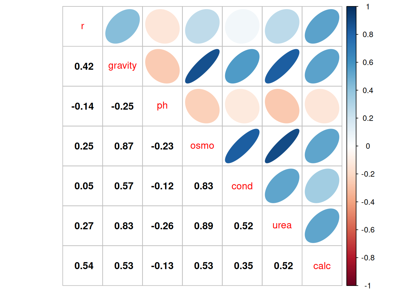 `urea` (urea concentration) appears to be a borderline case. However, if we refer back to our correlations among the variables, we see that `urea` is highly correlated with `gravity`, so we opt to remove it.