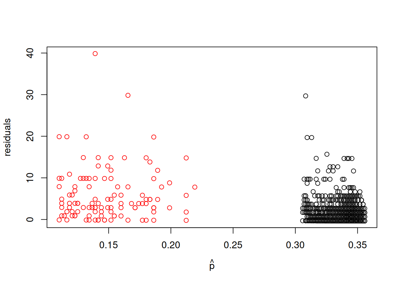 plot(p_hat[which(badhealth$badh==0)], resid[which(badhealth$badh==0)], xlim=range(p_hat), ylab="residuals", xlab=expression(hat(p)), ylim=range(resid))