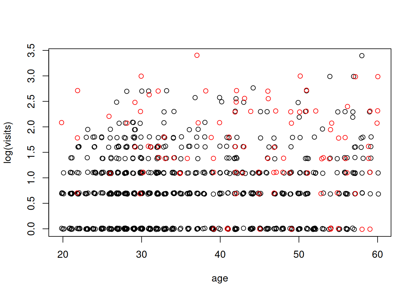 points(jitter(log(numvisit)) ~ jitter(age), data=badhealth, subset=badh==1, col="red")