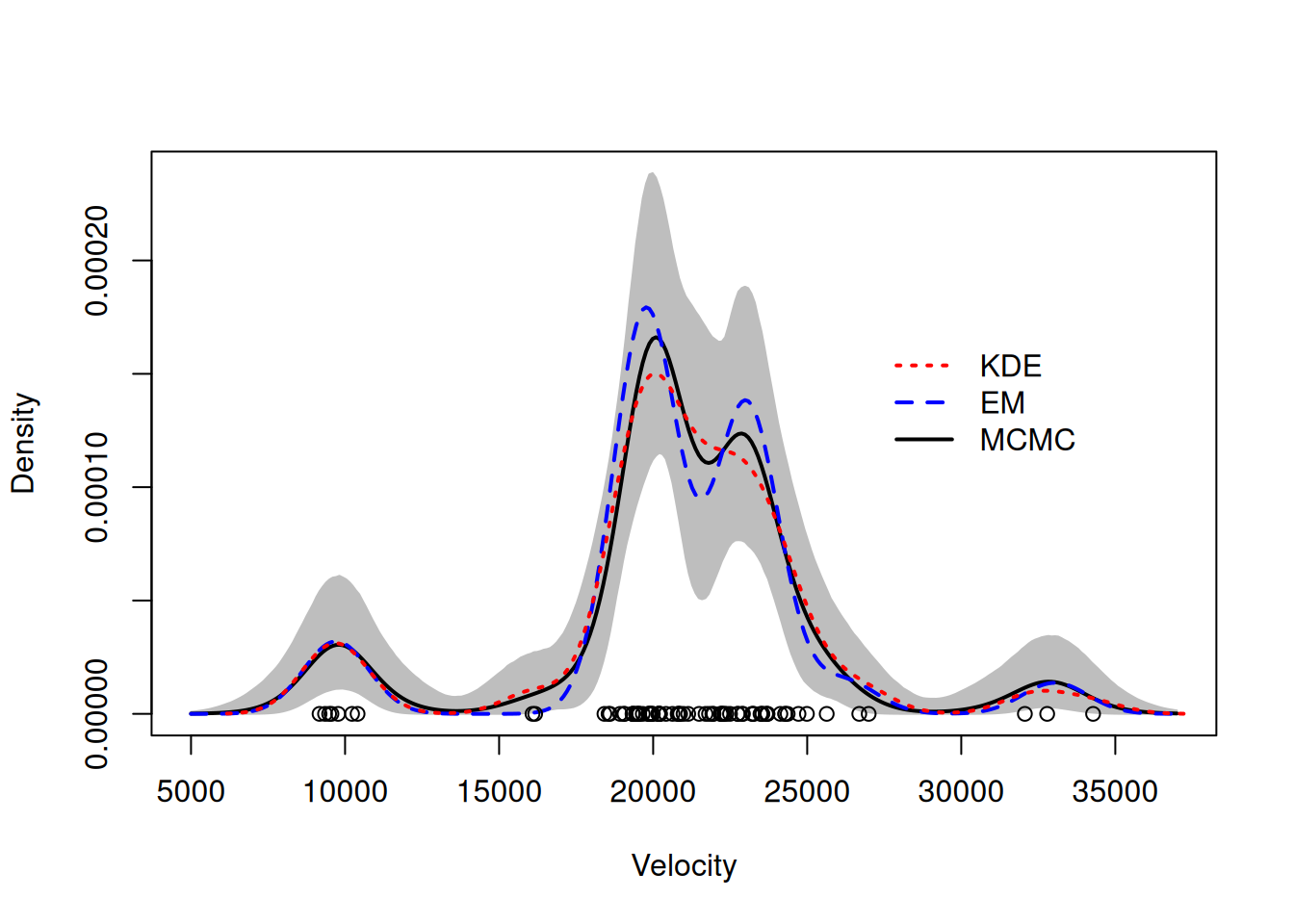 legend(27000, 0.00017, c("KDE","EM","MCMC"), col=colscale[c(3,2,1)], lty=c(3,2,1), lwd=2, bty="n")