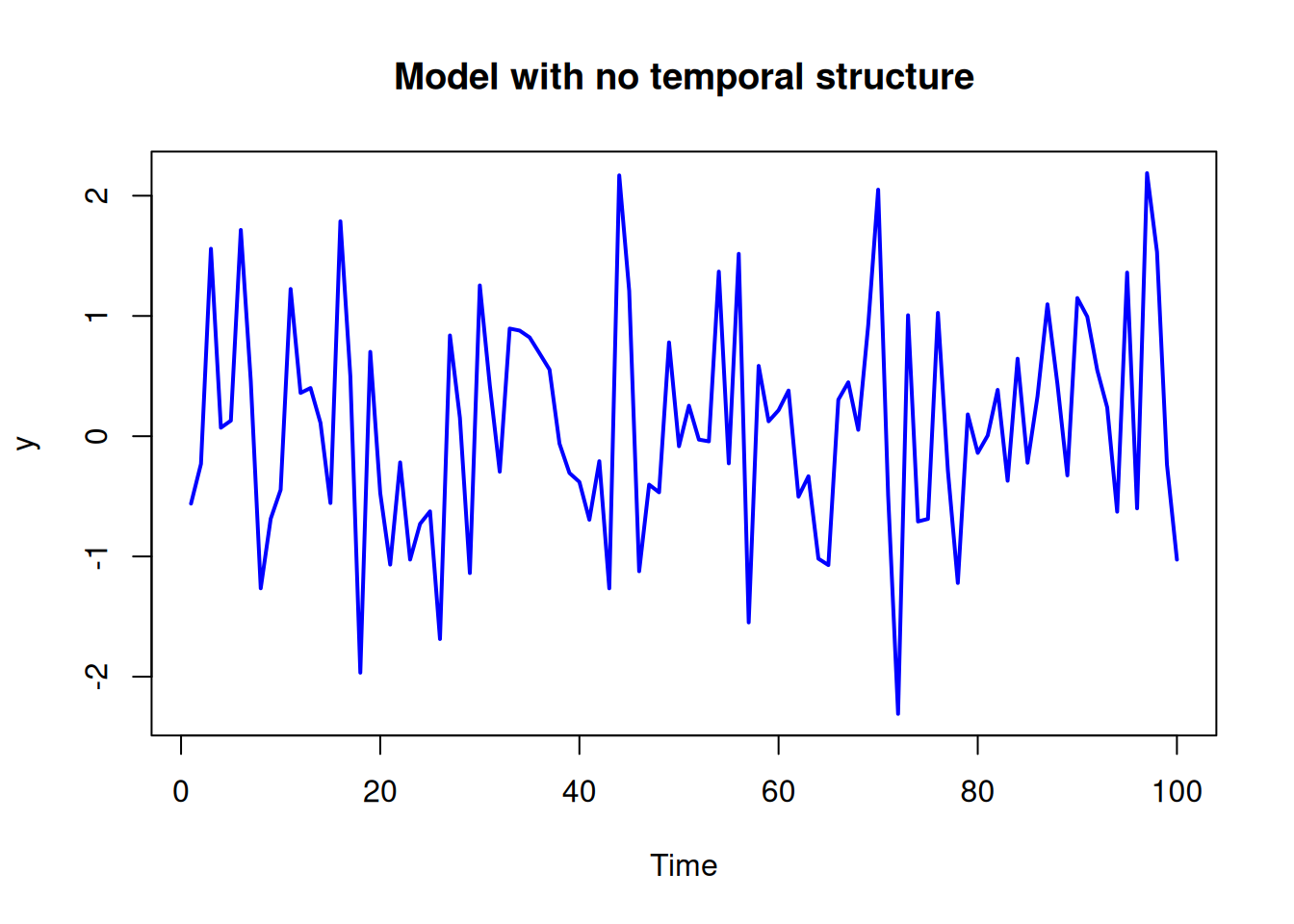 plot(y, type = "l", col = "blue", lwd = 2, xlab = "Time", ylab = "y", main = "Model with no temporal structure")Normal Dynamic Linear Models (NDLMs) are defined and illustrated in this module using several examples Model building based on the forecast function via the superposition principle is explained. Methods for Bayesian filtering, smoothing and forecasting for NDLMs in the case of known observational variances and known system covariance matrices are discussed and illustrated..