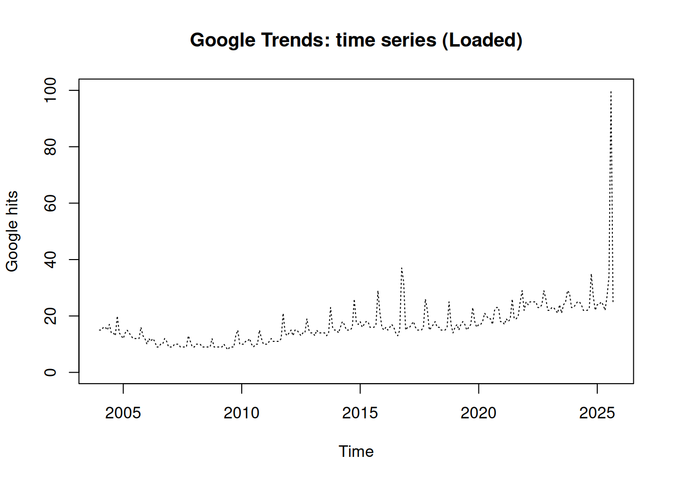 plot(loaded_csv$date, loaded_csv$hits, type = 'l', main = "Google Trends: time series (Loaded)",