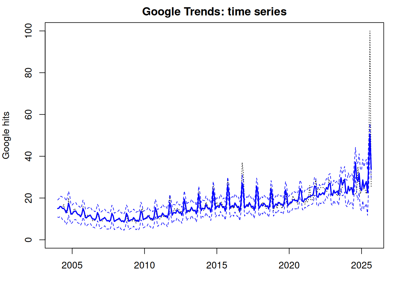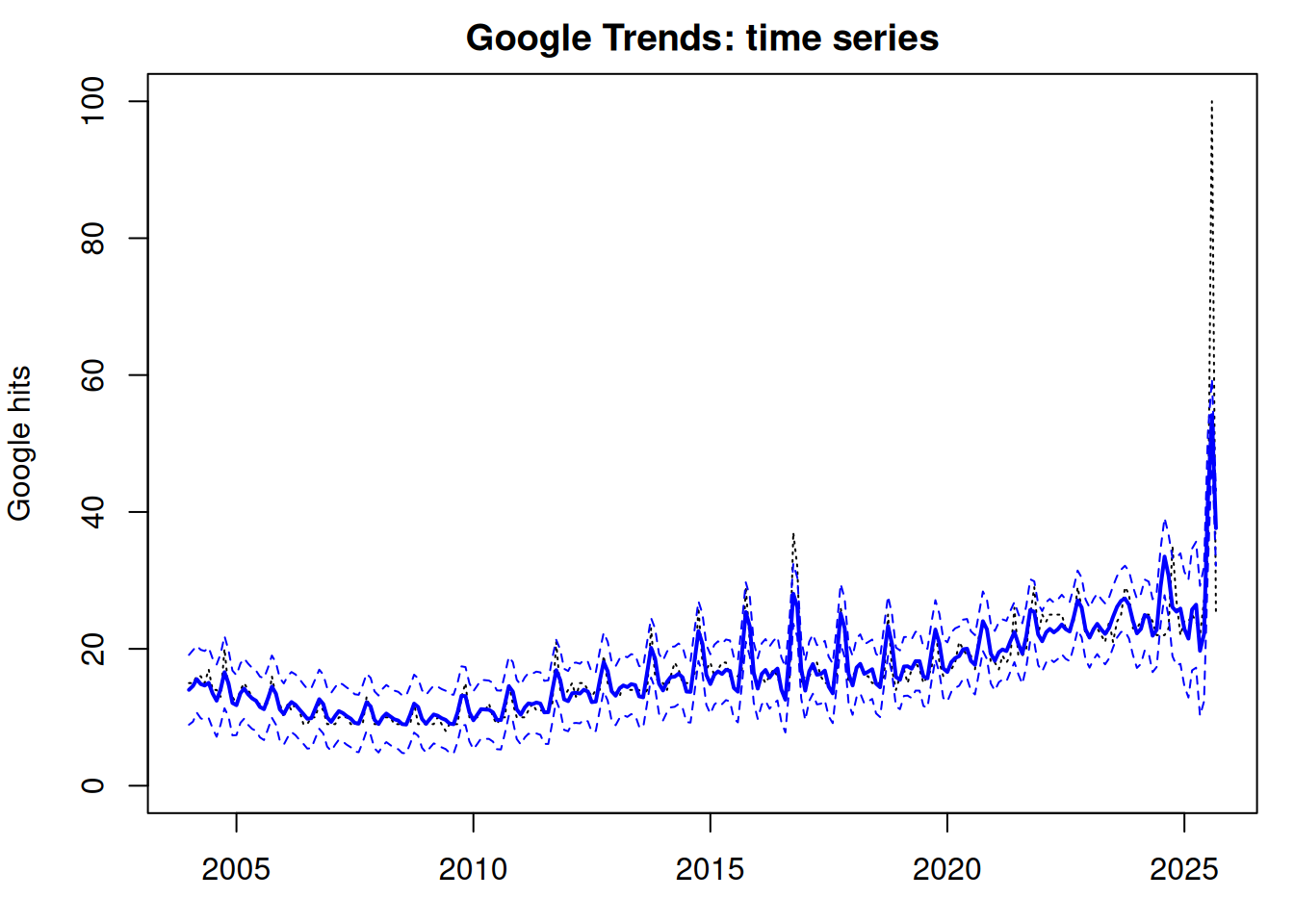 xlab='time', ylab='Google hits', lty=3, ylim=c(0,100))