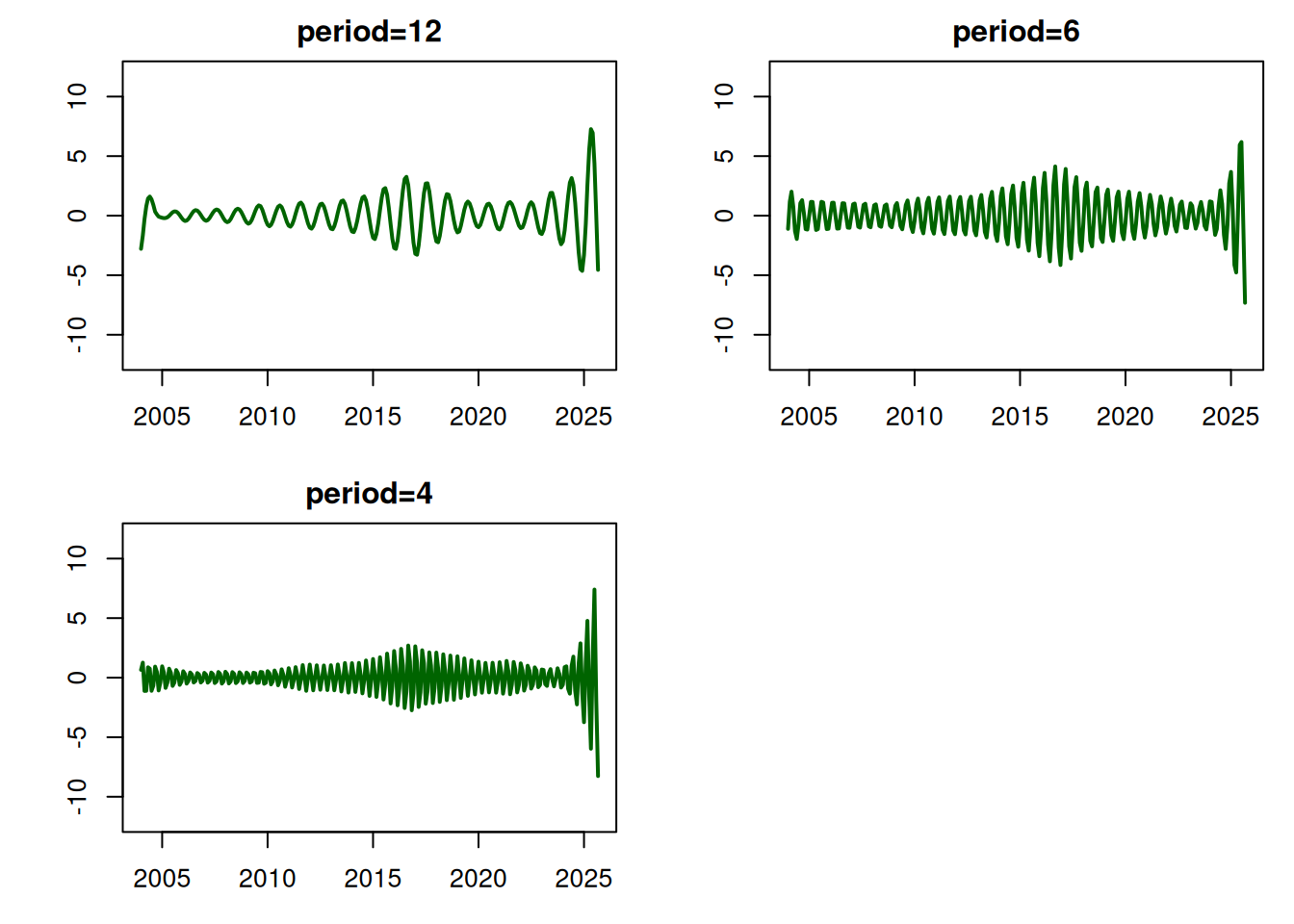 - a seasonal component that contains a fundamental period of p=12 and 2 additional harmonics for a total of 3 frequencies: \omega_1=2\pi/12, \omega_2=2\pi/6 and \omega_3=2\pi/4.?