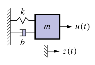 \begin{aligned} m\ddot{z}(t) &= u(t) - b \dot{z}(t) -k z(t) \\ \ddot{z}(t) &= \frac{1}{m} u(t) - \frac{b}{m} \dot{z}(t) -\frac{k}{m} z(t) \\ \end{aligned} \tag{124.1}