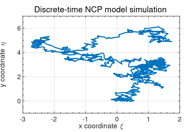 Therefore, we arrive at the discrete-time form of the NCP model: \begin{aligned} x_{k+1}&= x_k + \Delta t w_k \\ z_k &= x_k + v_k \end{aligned} \tag{129.1}