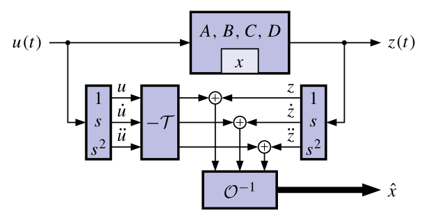 - Thus, if the observability matrix \mathcal{O} is invertible, then: x(0) = \mathcal{O}^{-1} \left( \begin{bmatrix}z(0) \\ \dot{z}(0) \\ \ddot{z}(0) \end{bmatrix} - \mathcal{T} \begin{bmatrix} u(0) \\ \dot{u}(0) \\ \ddot{u}(0) \end{bmatrix} \right)