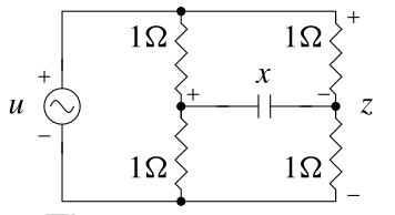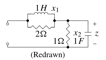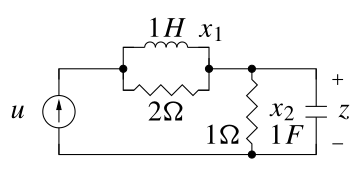 - In the second circuit, if u(t) = 0, x_1(0) \neq 0 and x_2(0) = 0, then \dot{z}(t) = 0 and we cannot determine x_1(0) (circuit redrawn for u(t) = 0).