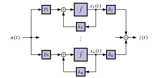 \begin{aligned} \dot{x}(t) &= \begin{bmatrix} \lambda_1 & 0 & \cdots & 0 \\ 0 & \lambda_2 & \cdots & 0 \\ \vdots & \vdots & \ddots & \vdots \\ 0 & 0 & \cdots & \lambda_n \end{bmatrix} x(t) + \begin{bmatrix} \gamma_1 \\ \gamma_2 \\ \vdots \\ \gamma_n \end{bmatrix} u(t) \\ z(t) &= \begin{bmatrix} \delta_1 & \delta_2 & \cdots & \delta_n \end{bmatrix} x(t) + d u(t) \end{aligned}