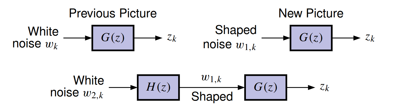 - Can drive our linear system with noise that has desired characteristics by introducing shaping filter H(\cdot) that itself is driven by white noise.
