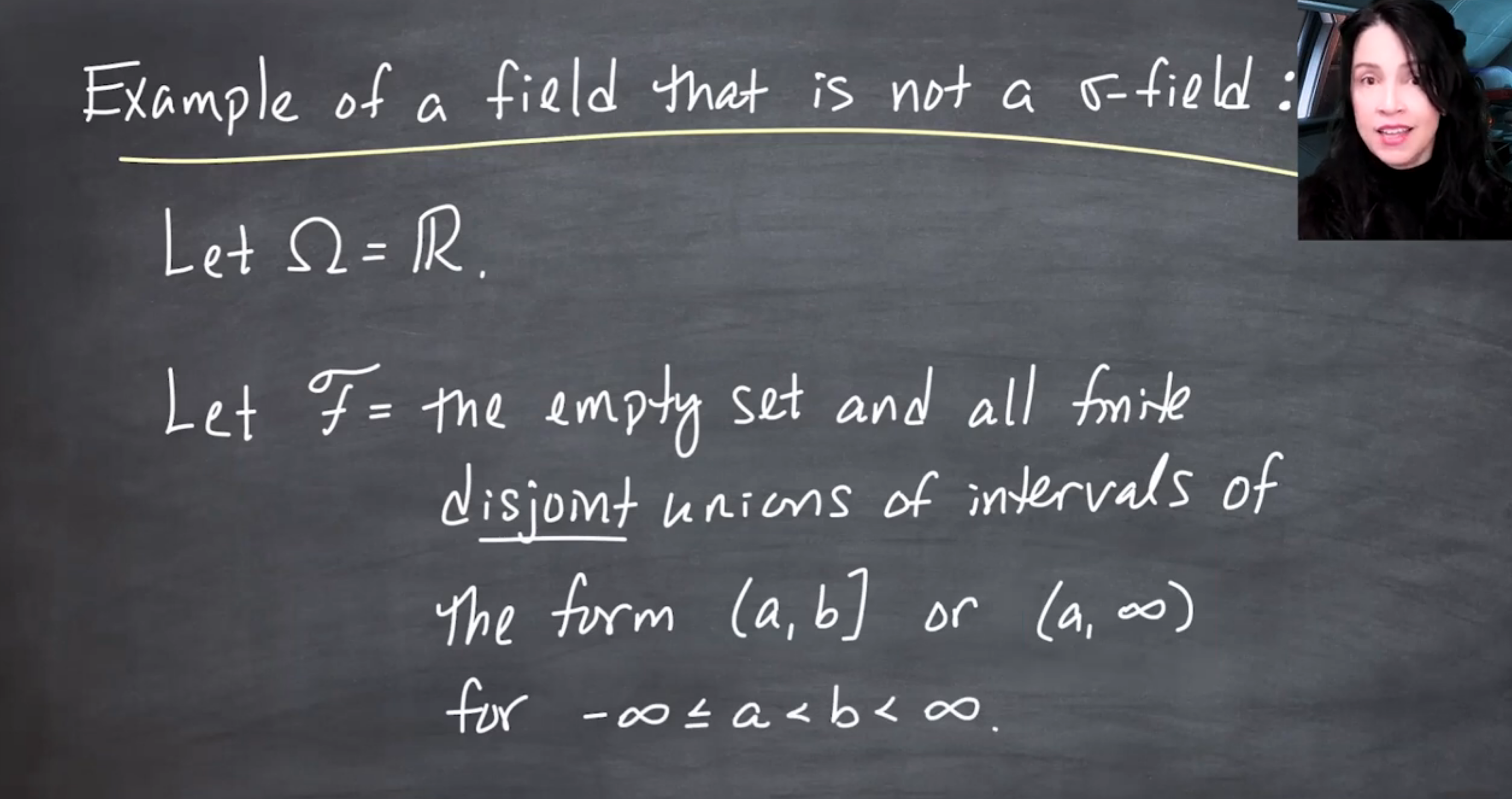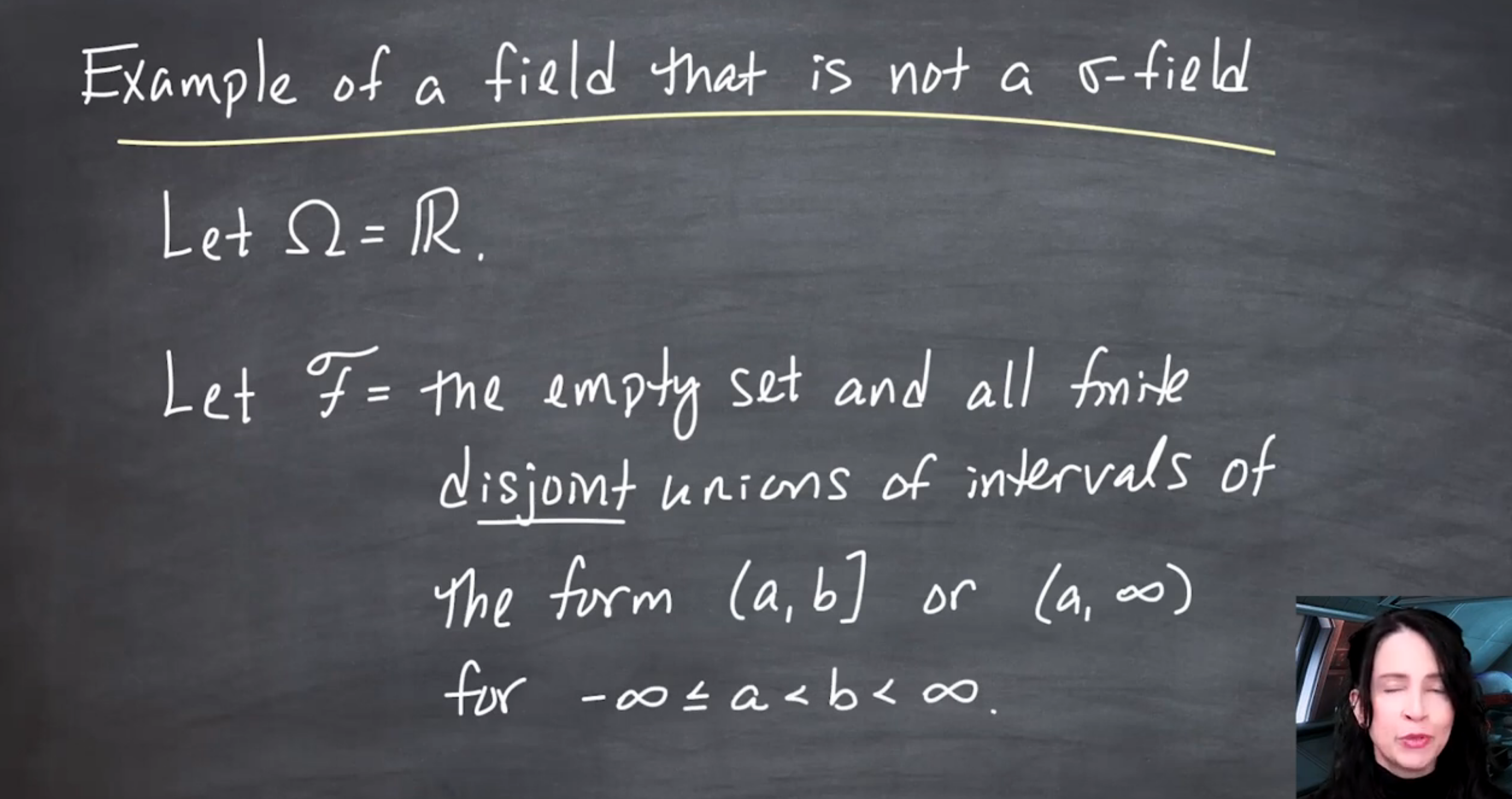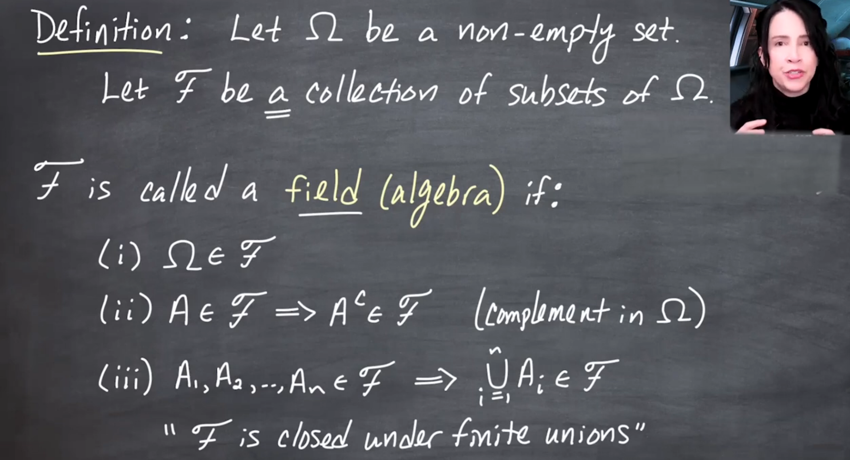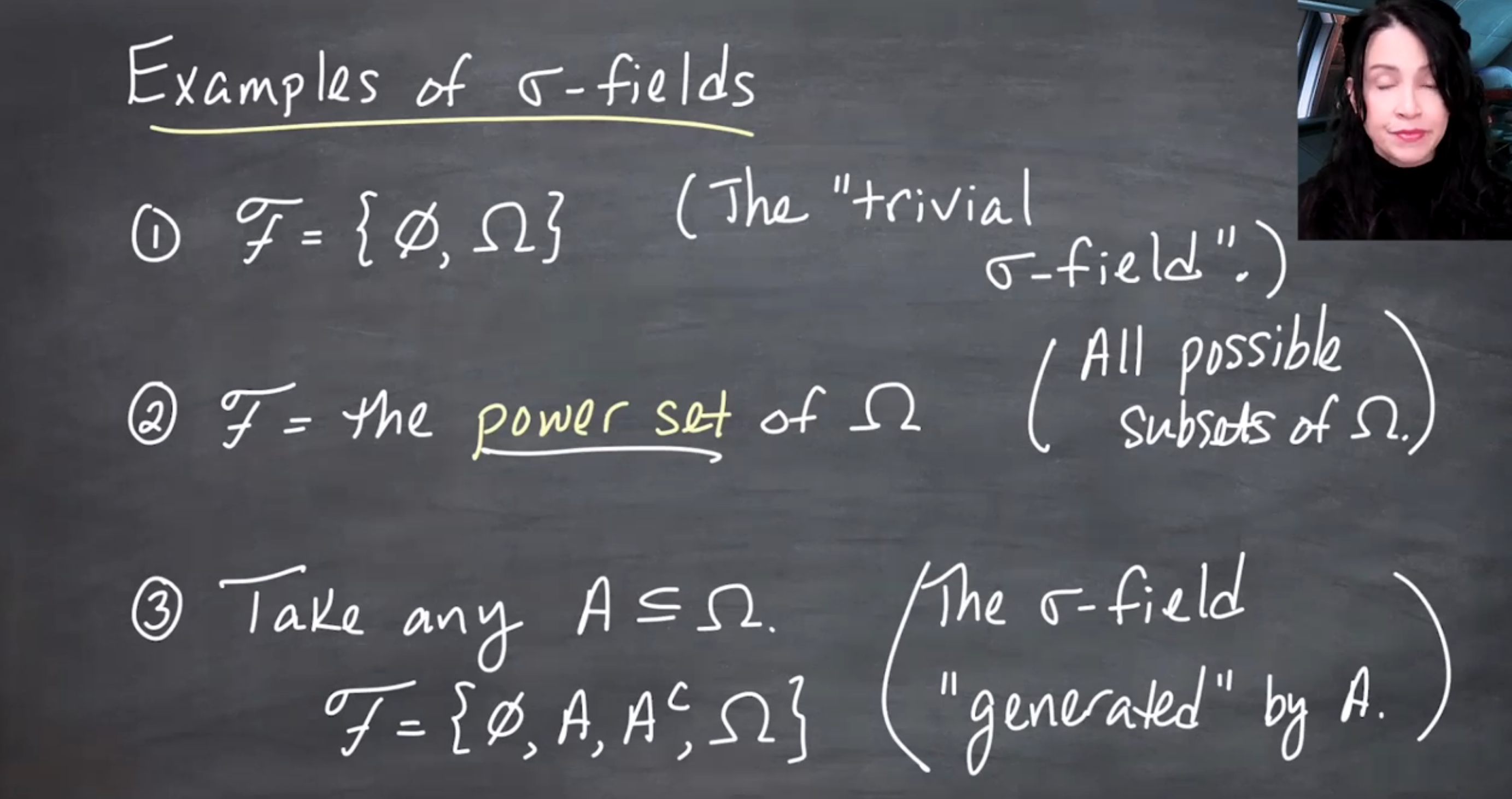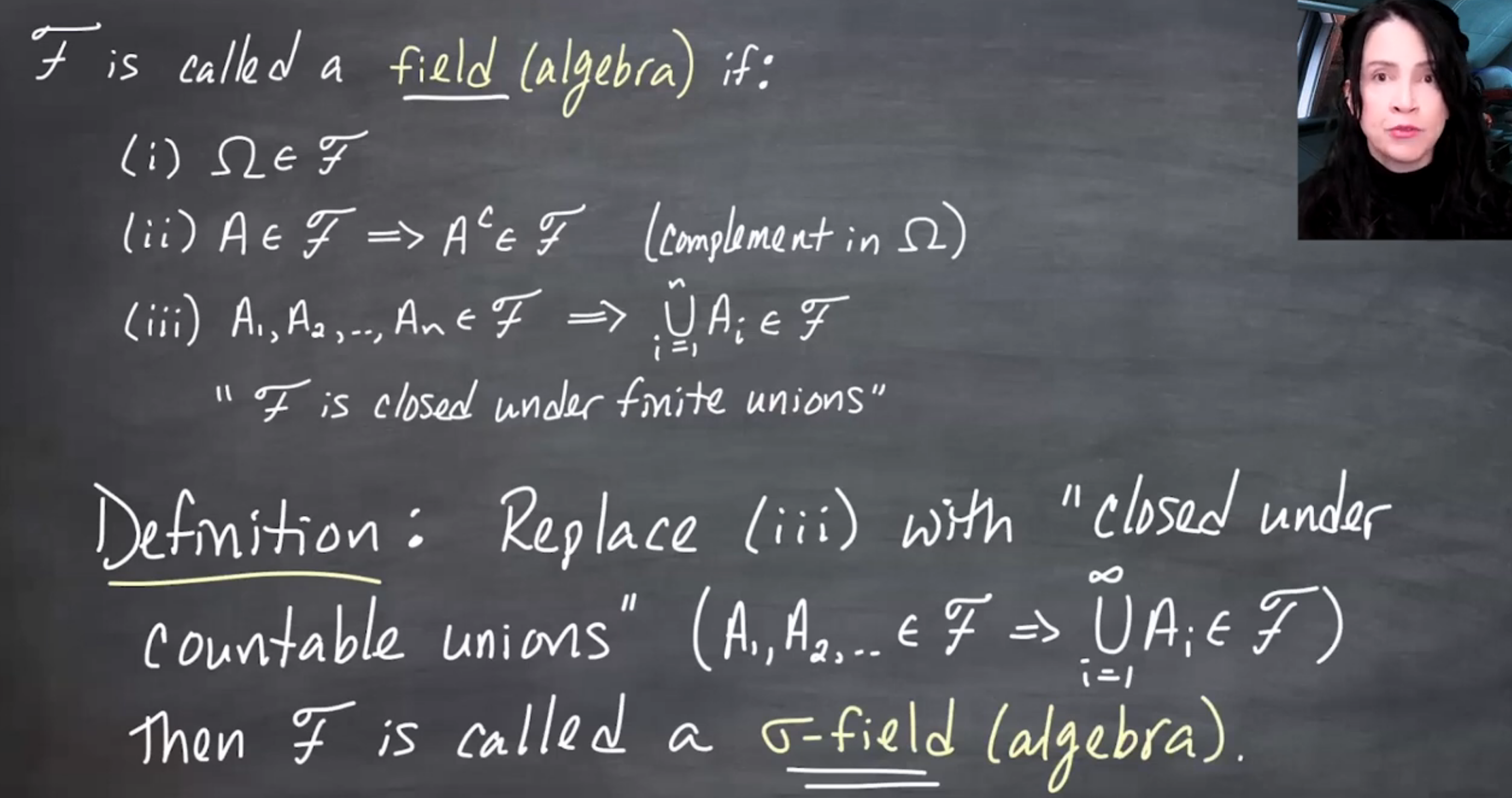 The video distinguishes \sigma-fields (or \sigma-algebras) from fields
