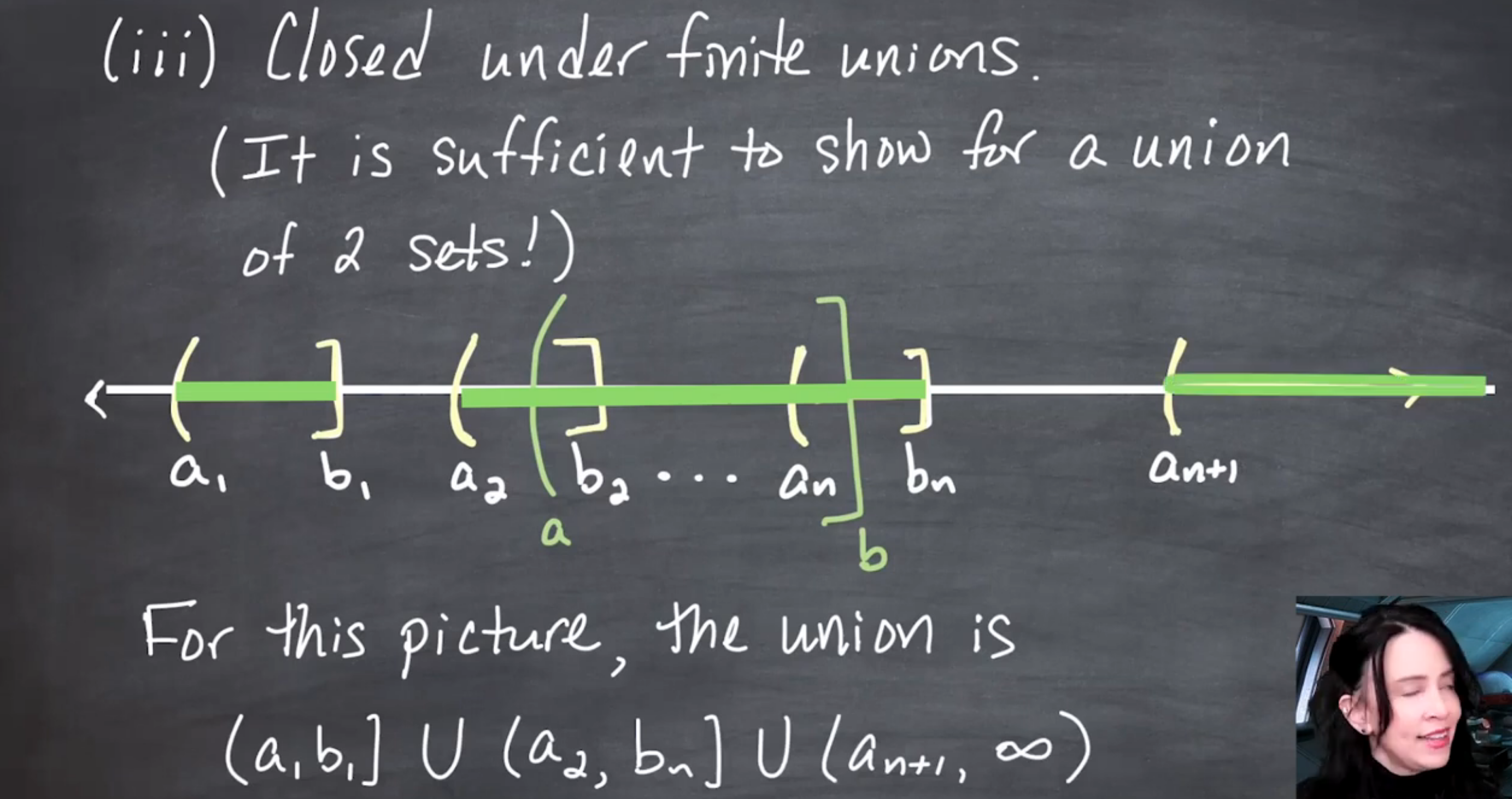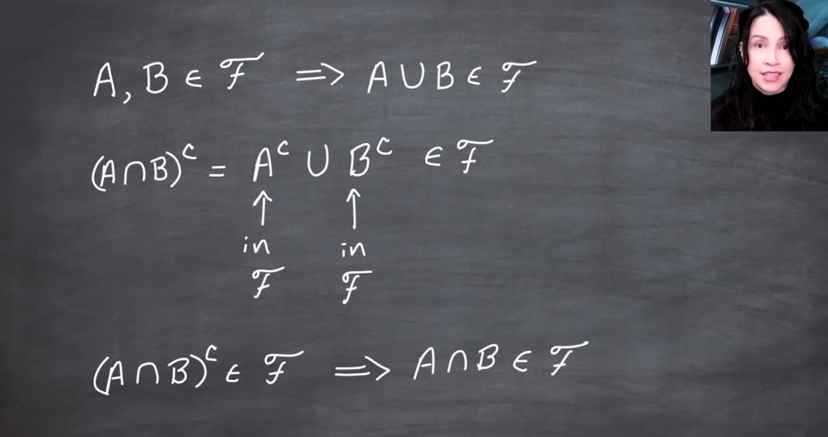 In this slide Jem demonstrates how we can use de Morgan’s law to show that if a collection of sets is closed under complements and finite unions, then it is also closed under finite intersections.