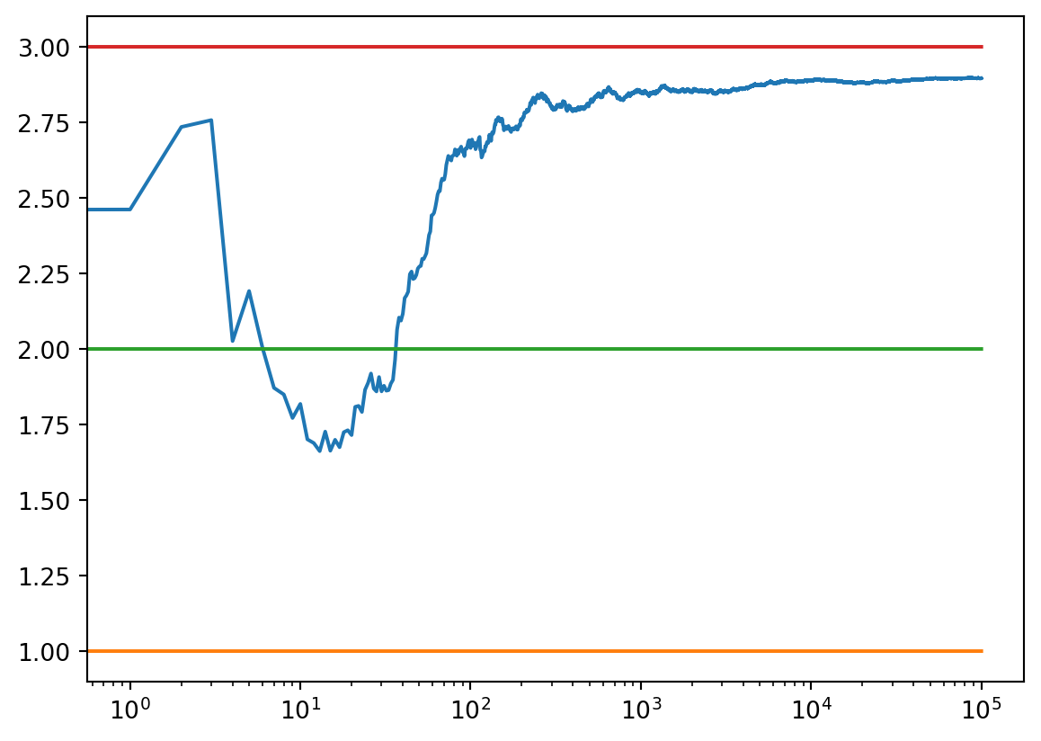 # Import required libraries import numpy as np import matplotlib.pyplot as plt # Define Action class class Actions: def__init__(self, m): self.m = m self.mean =0self.N =0# Choose a random action def choose(self): return np.random.randn() +self.m # Update the action-value estimate def update(self, x): self.N +=1self.mean = (1-1.0/self.N)*self.mean +1.0/self.N * x def run_experiment(m1, m2, m3, eps, N): actions = [Actions(m1), Actions(m2), Actions(m3)] data = np.empty(N) for i inrange(N): # epsilon greedy p = np.random.random() if p < eps: j = np.random.choice(3) else: j = np.argmax([a.mean for a in actions]) x = actions[j].choose() actions[j].update(x) # for the plot data[i] = x cumulative_average = np.cumsum(data) / (np.arange(N) +1) # plot moving average ctr plt.plot(cumulative_average) plt.plot(np.ones(N)*m1) plt.plot(np.ones(N)*m2) plt.plot(np.ones(N)*m3) plt.xscale('log') plt.show() for a in actions: print(a.mean) return cumulative_average